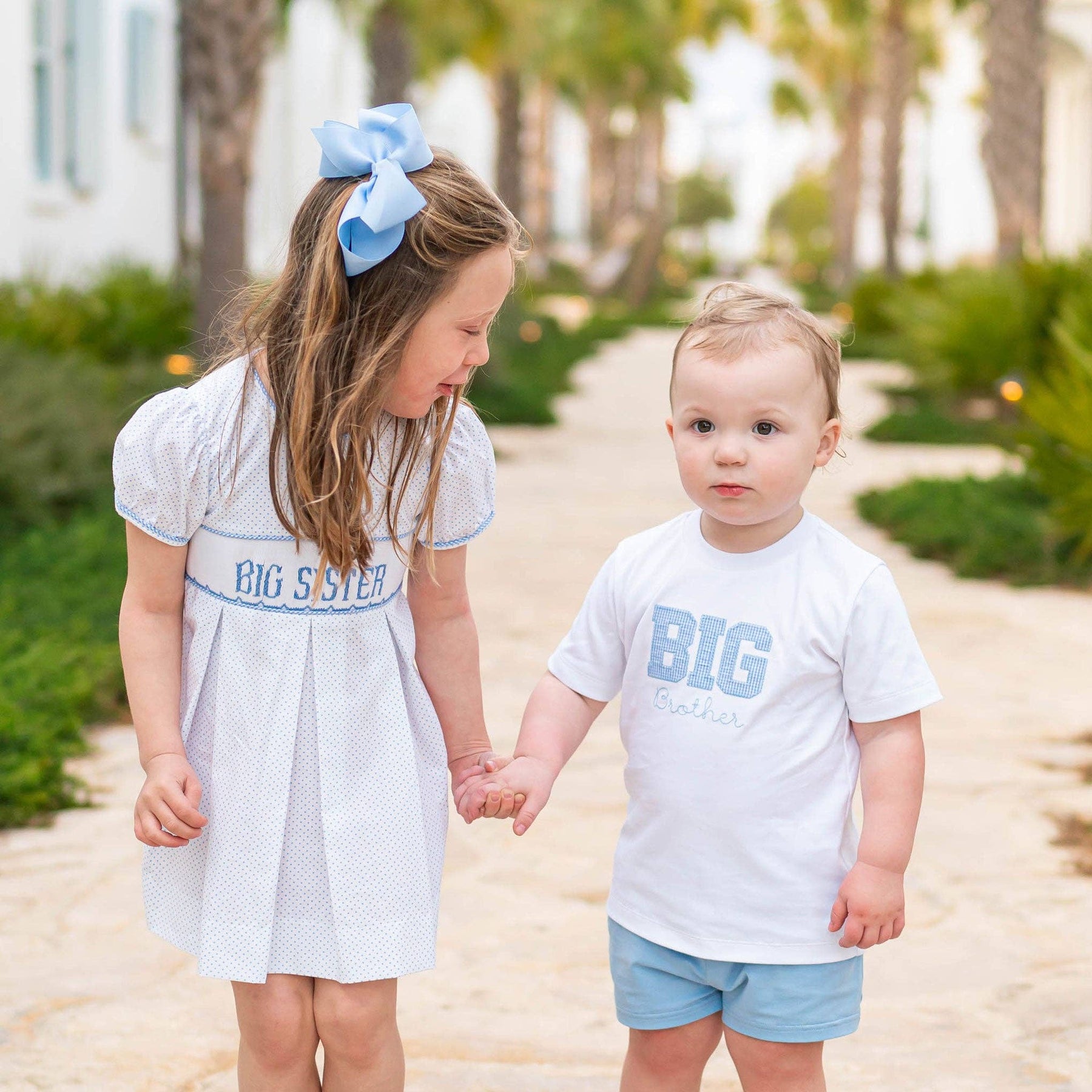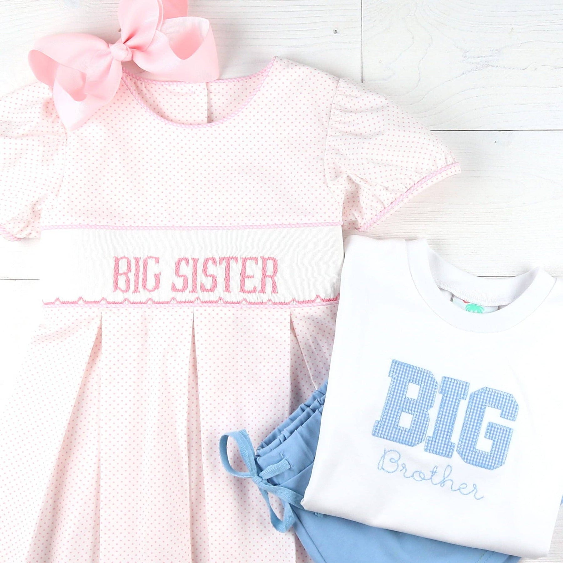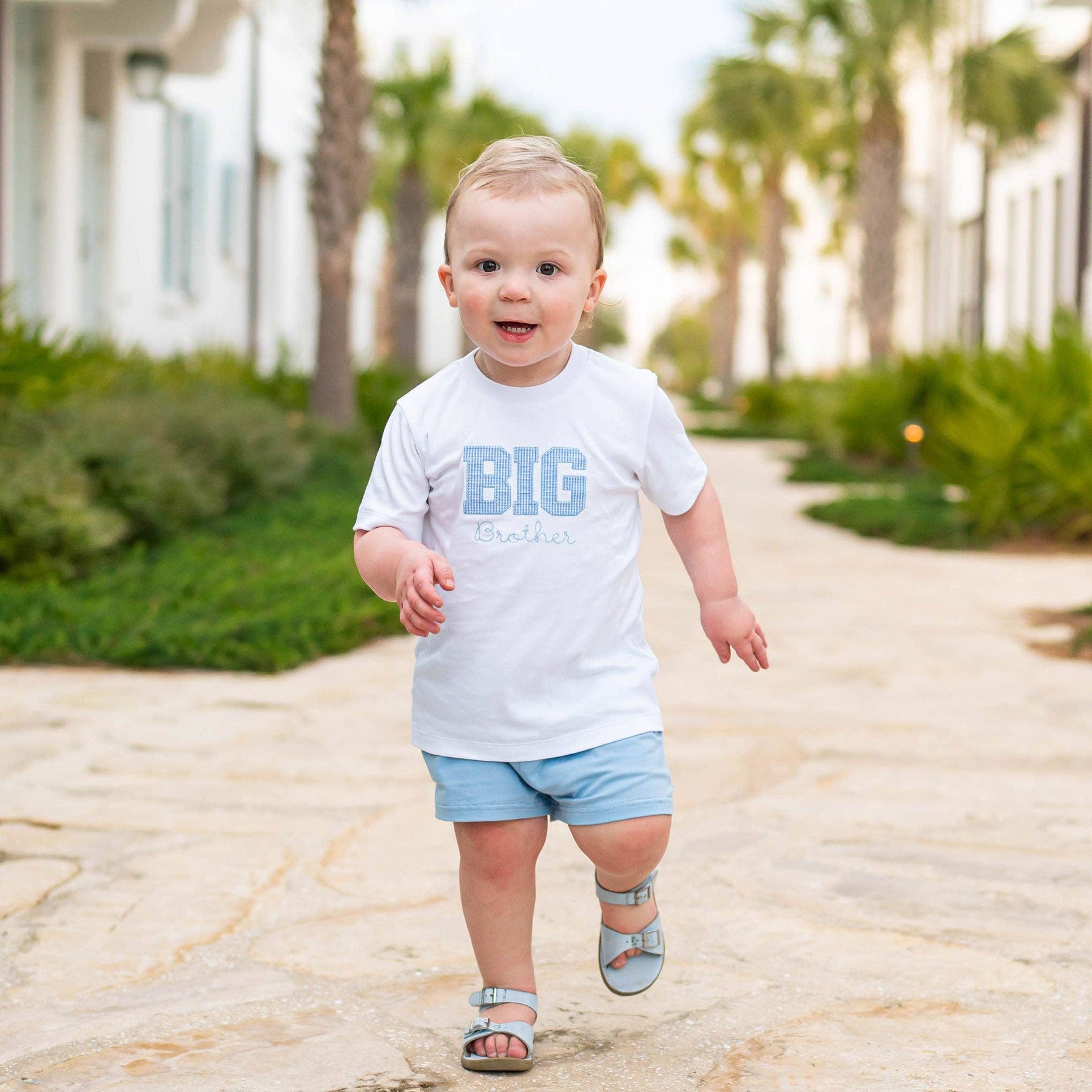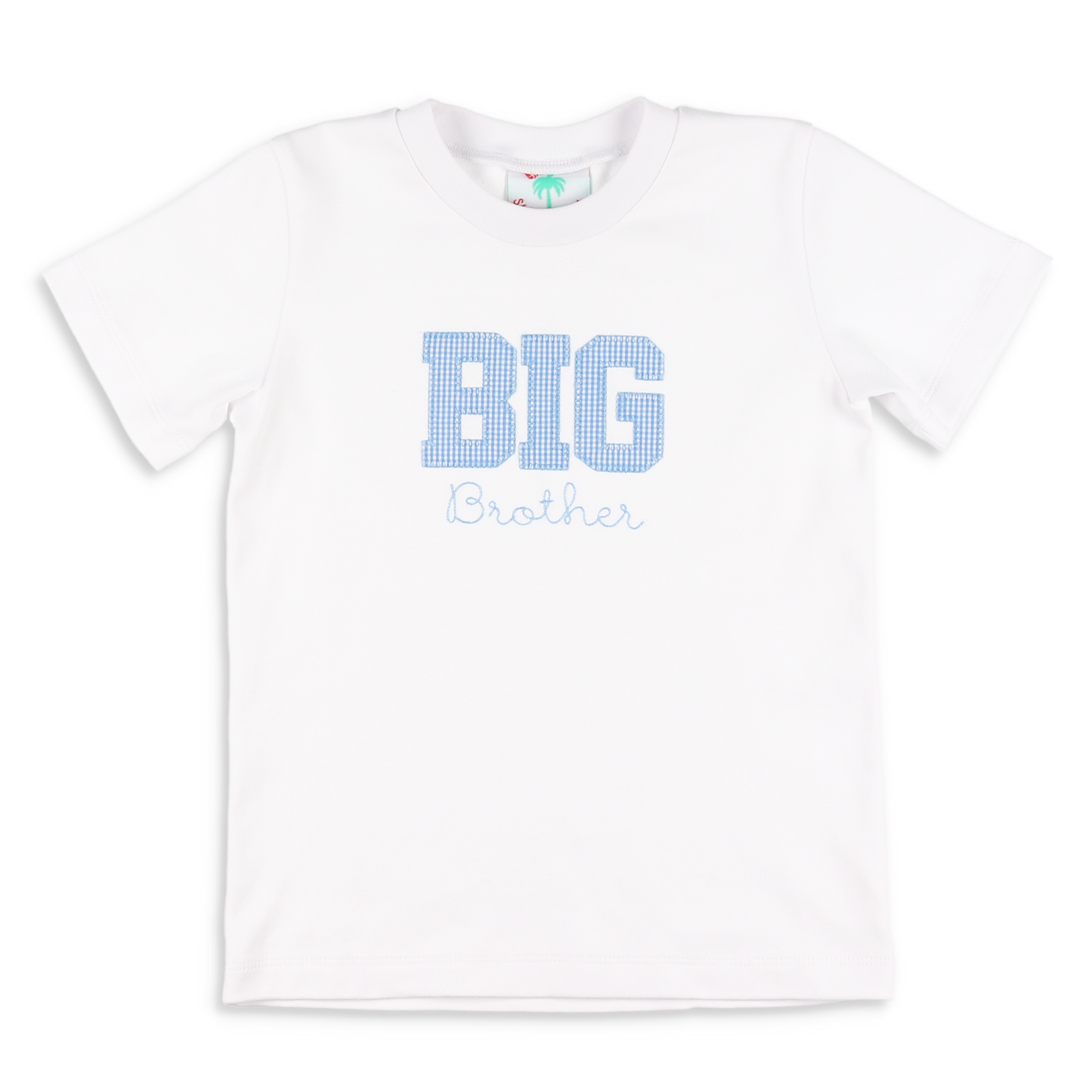 Celebrate a new arrival with this charming Big Brother T-Shirt from Shrimp & Grits Kids. Crafted from soft white cotton knit, it features a distinctive blue and white micro check applique spelling "BIG" with "Brother" delicately embroidered beneath. The banded neckline and short sleeves ensure comfort for everyday wear. Pair it with coordinating blue knit shrimp shorts for a polished look, or create matching sibling moments with our Big Sister dress—ideal for gender reveals, announcements, and those treasured family photographs.