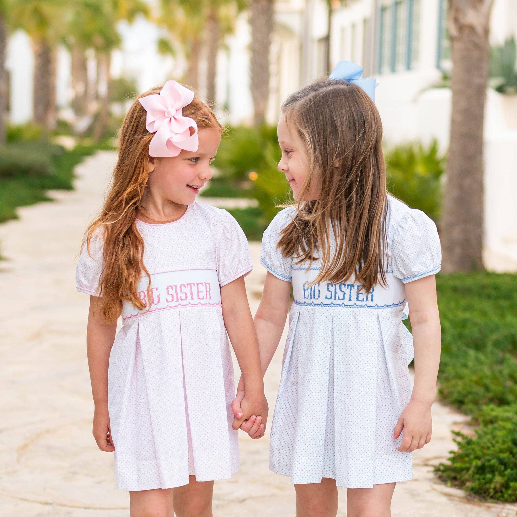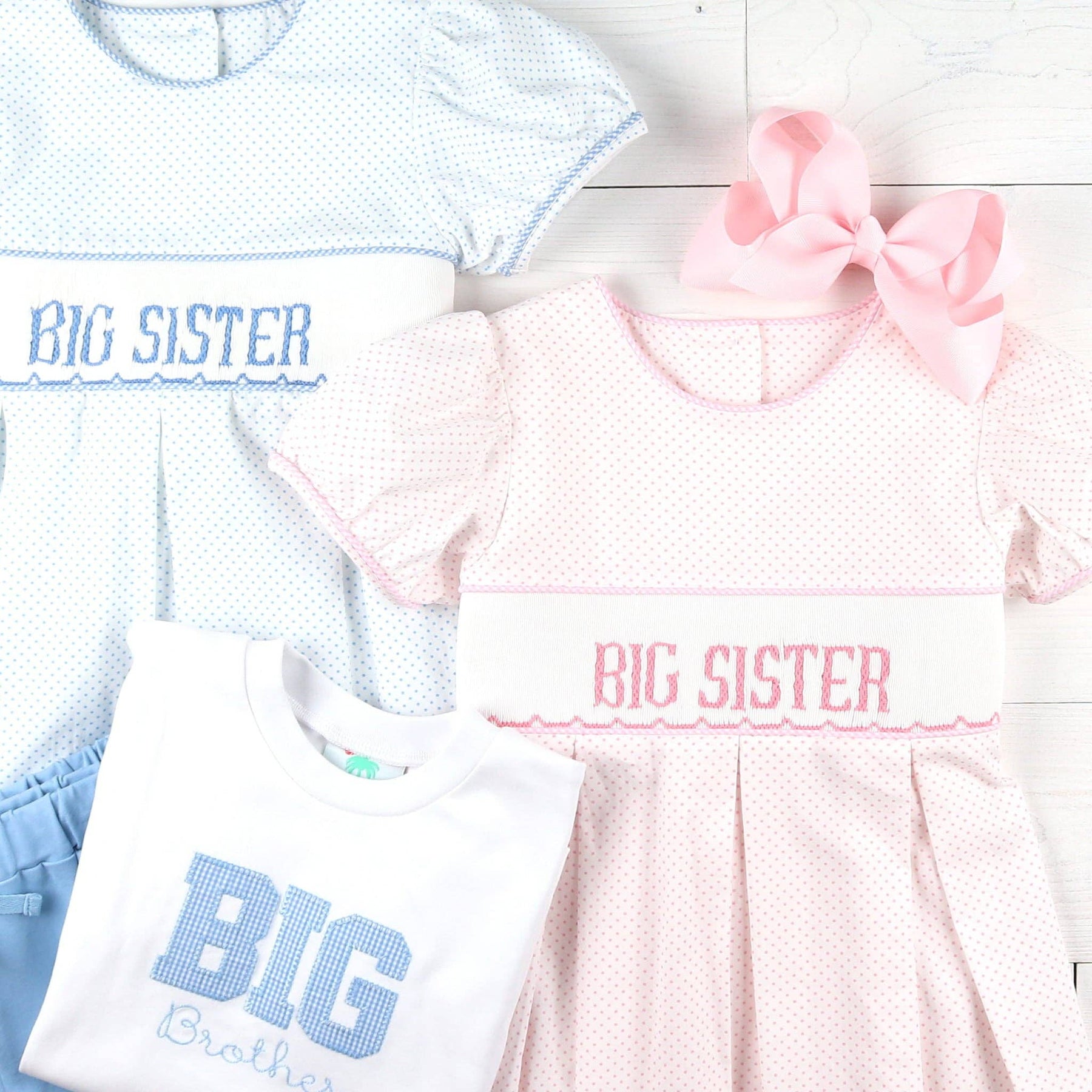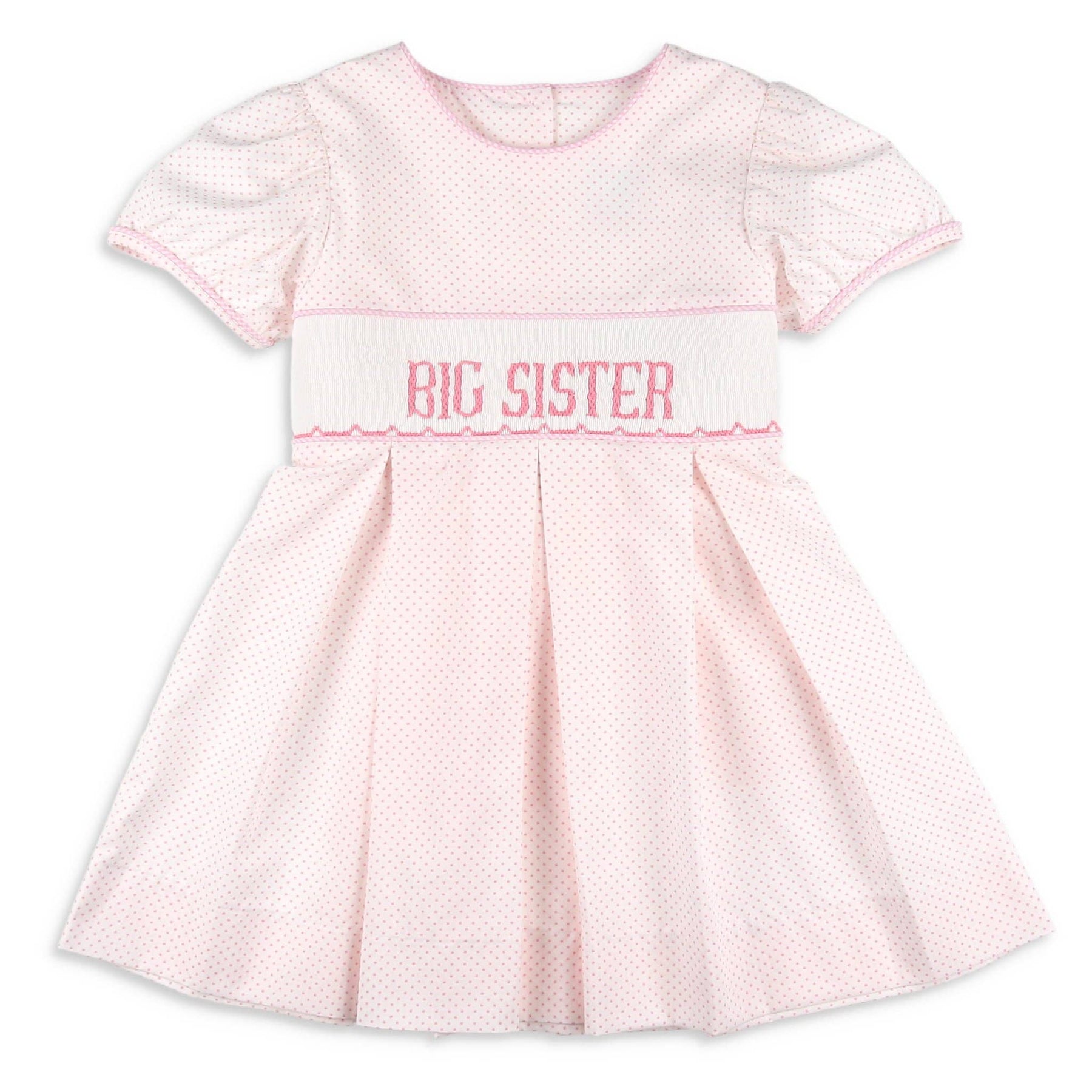 Celebrate a new arrival in style with this charming Girls Smocked Dress by Shrimp and Grits Kids. Crafted from soft white cotton adorned with delicate pink polka dots, this dress features hand-smocked "BIG SISTER" lettering across the chest—a meaningful keepsake for this special milestone. Vintage-inspired details include pink picot trim on the neckline and puff sleeves, pleated skirt, coordinating buttons down the back, and a tie sash. Pair with the matching Big Brother T-shirt for coordinated sibling photos that capture this precious moment.