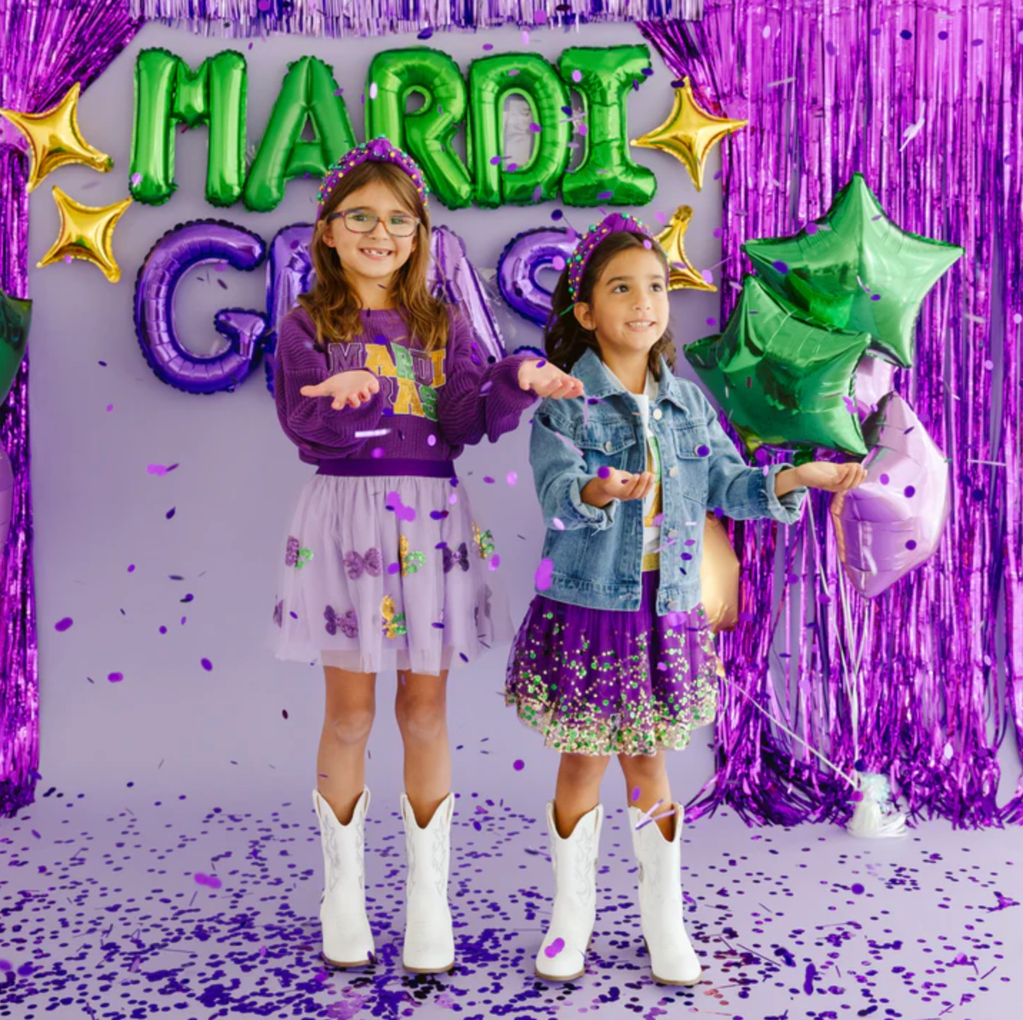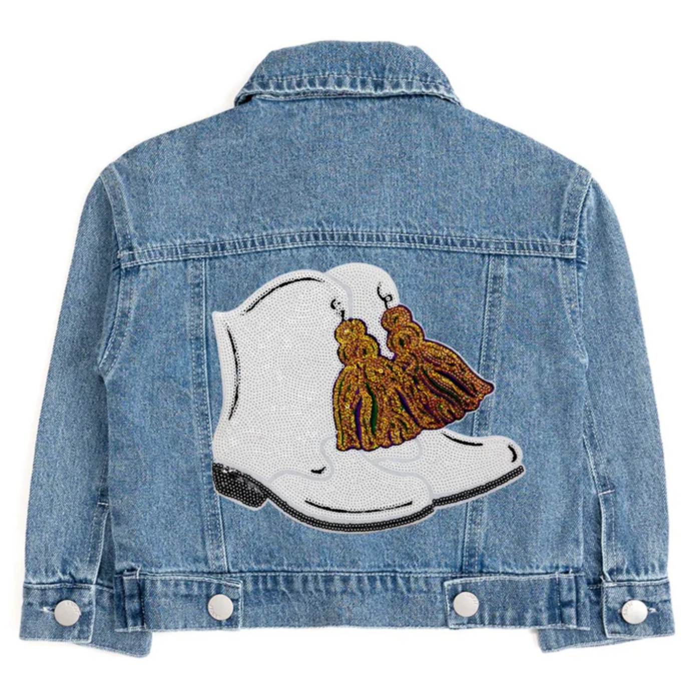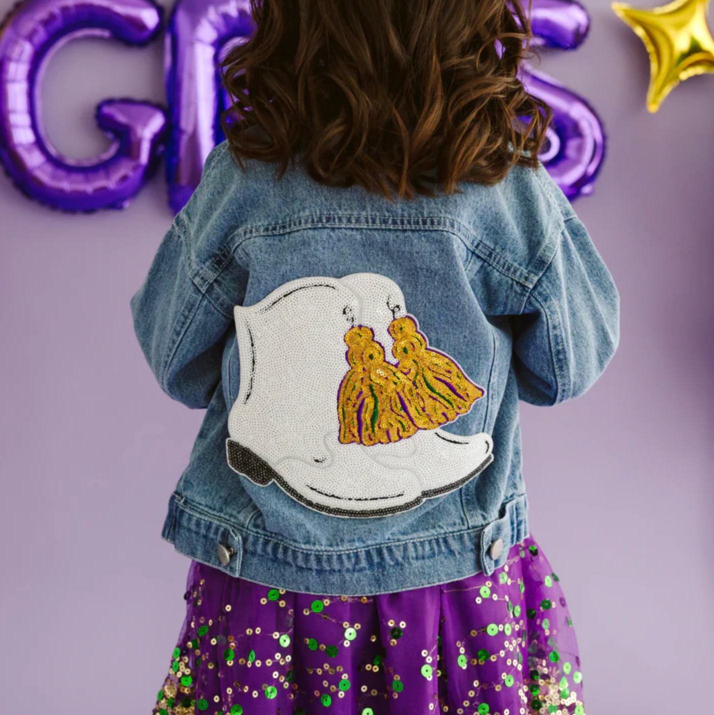The Mardi Boots Sequin Patch Denim Jacket is a fun and festive jacket for any Mardi Gras celebration or everyday wear!
