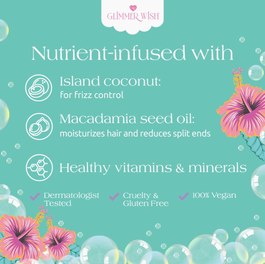 Keep your little mermaid’s hair smooth and fragrant with our Mermaid Hair Detangler Mist by Glimmer Wish. This gentle, cruelty-free formula effortlessly loosens knots and taming frizz, leaving hair soft and shiny. Infused with nourishing island coconut and macadamia seed oils, it conditions while delivering a delightful sugary pineapple coconut breeze scent. Perfect for all hair types, it’s dermatologist tested and free from sulfates, parabens, gluten, and other harsh chemicals. Mist, comb, and let your child’s hair shine like a true ocean treasure!