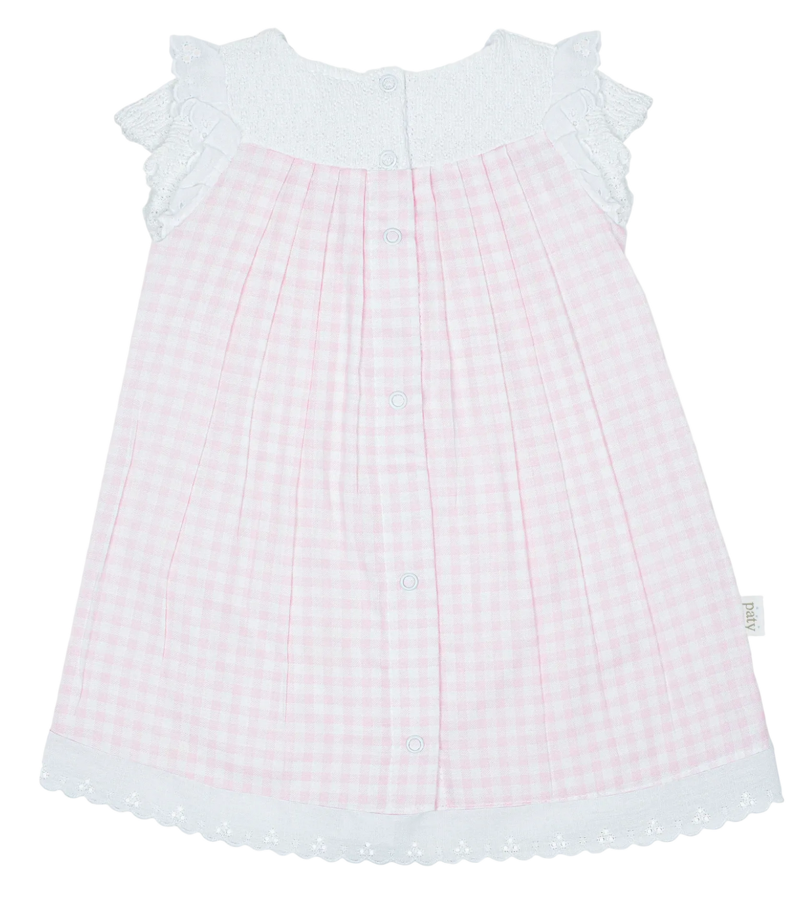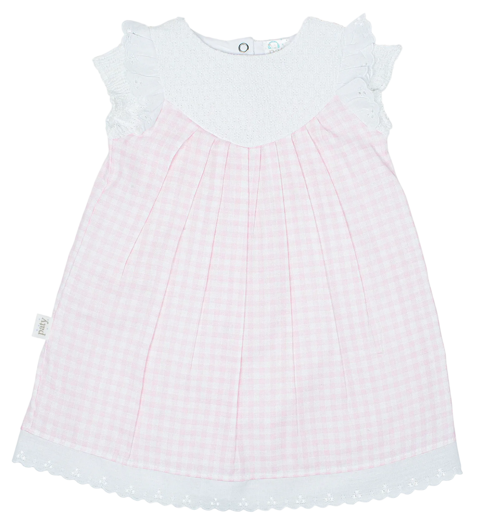 A sweet blend of classic textures and timeless style, this Paty knit baby dress features a soft Paty knit bodice paired with a lightweight cotton gingham woven skirt for a charming layered look. Delicate eyelet flutter sleeves add a beautiful feminine detail, while the softly pleated skirt creates a graceful silhouette perfect for everyday wear or special moments.  Finished with a subtle eyelet hem detail and an easy back snap closure, this dress offers both comfort and classic heirloom style for little ones.  A lovely choice for baby showers, family gatherings, and warm-weather occasions.  Proudly made in the USA