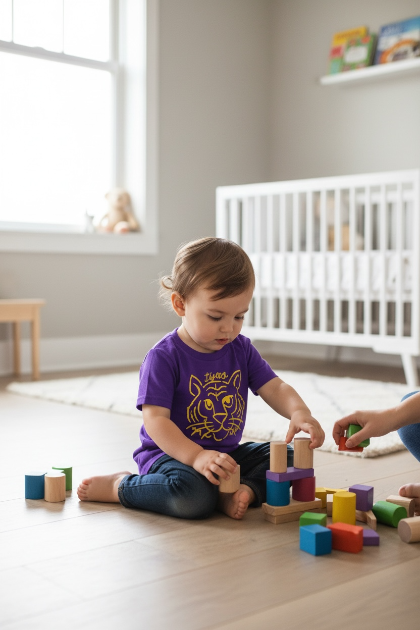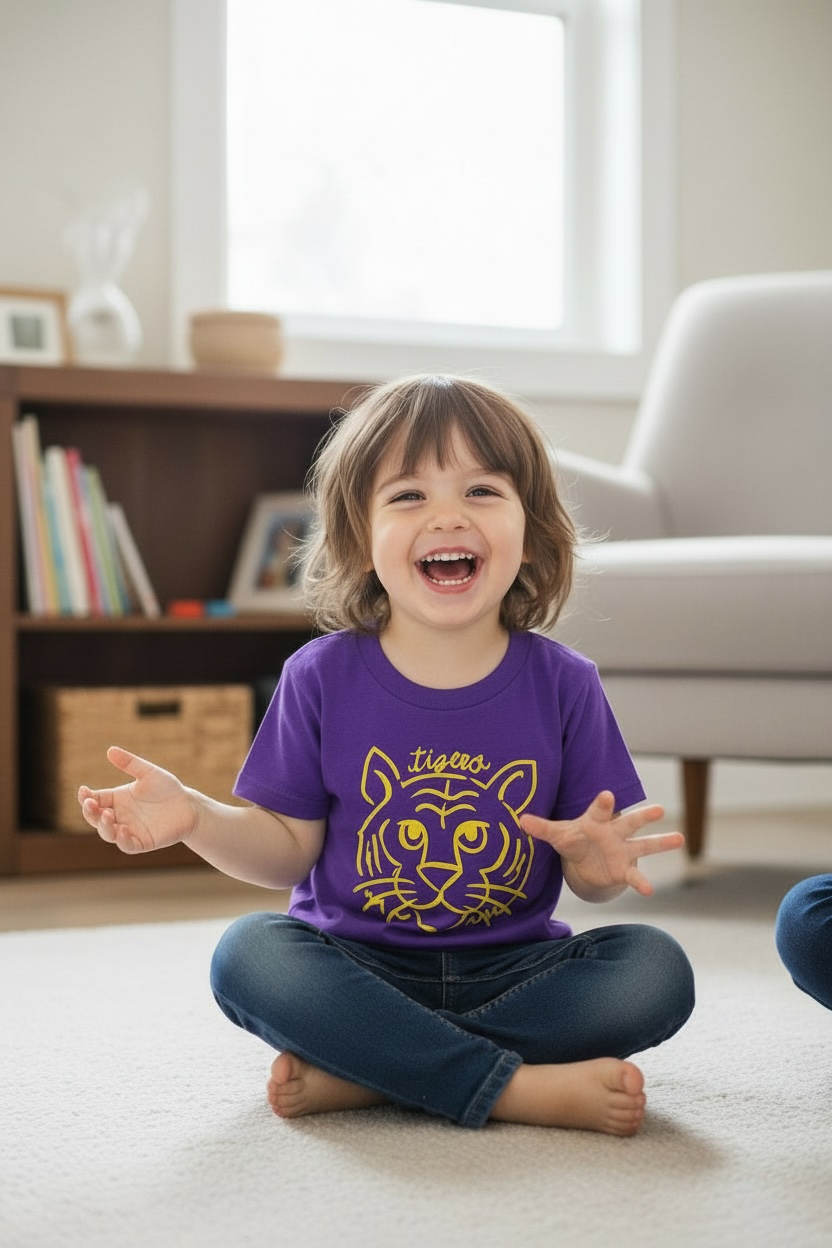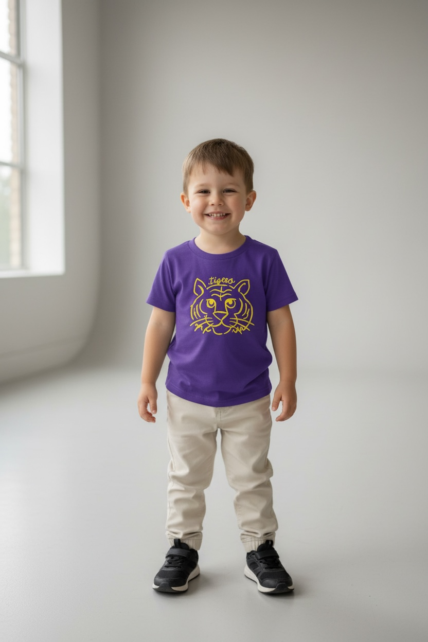 Celebrate local craftsmanship with our Tigers T-Shirt, a handmade favorite featuring a striking gold tiger design on soft, breathable purple cotton. Each shirt is carefully crafted locally, bringing quality and character to your child's everyday wardrobe. Perfect for tiger lovers and kids who appreciate unique, artisan-made pieces that stand out from the ordinary.