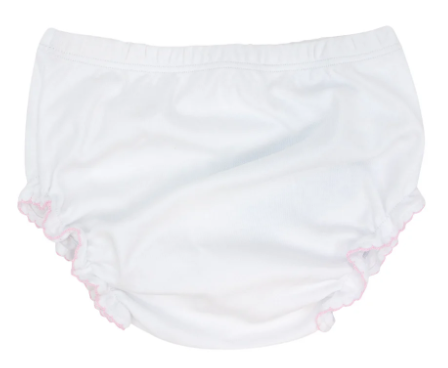 Crafted from luxurious Peruvian pima cotton, these bloomers offer unmatched softness and breathability for delicate baby skin. The newborn size features charming pink piping around the gathered leg openings, while all other sizes showcase classic white. Perfect for layering under dresses or wearing solo, these bloomers combine comfort with timeless style—a wardrobe essential for every baby girl.