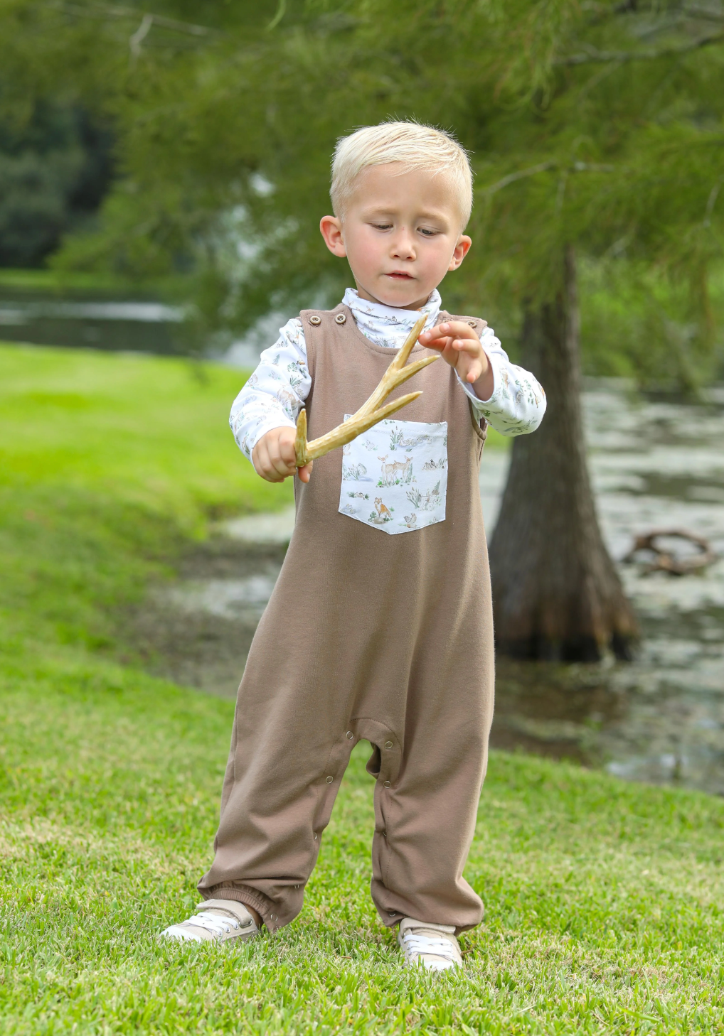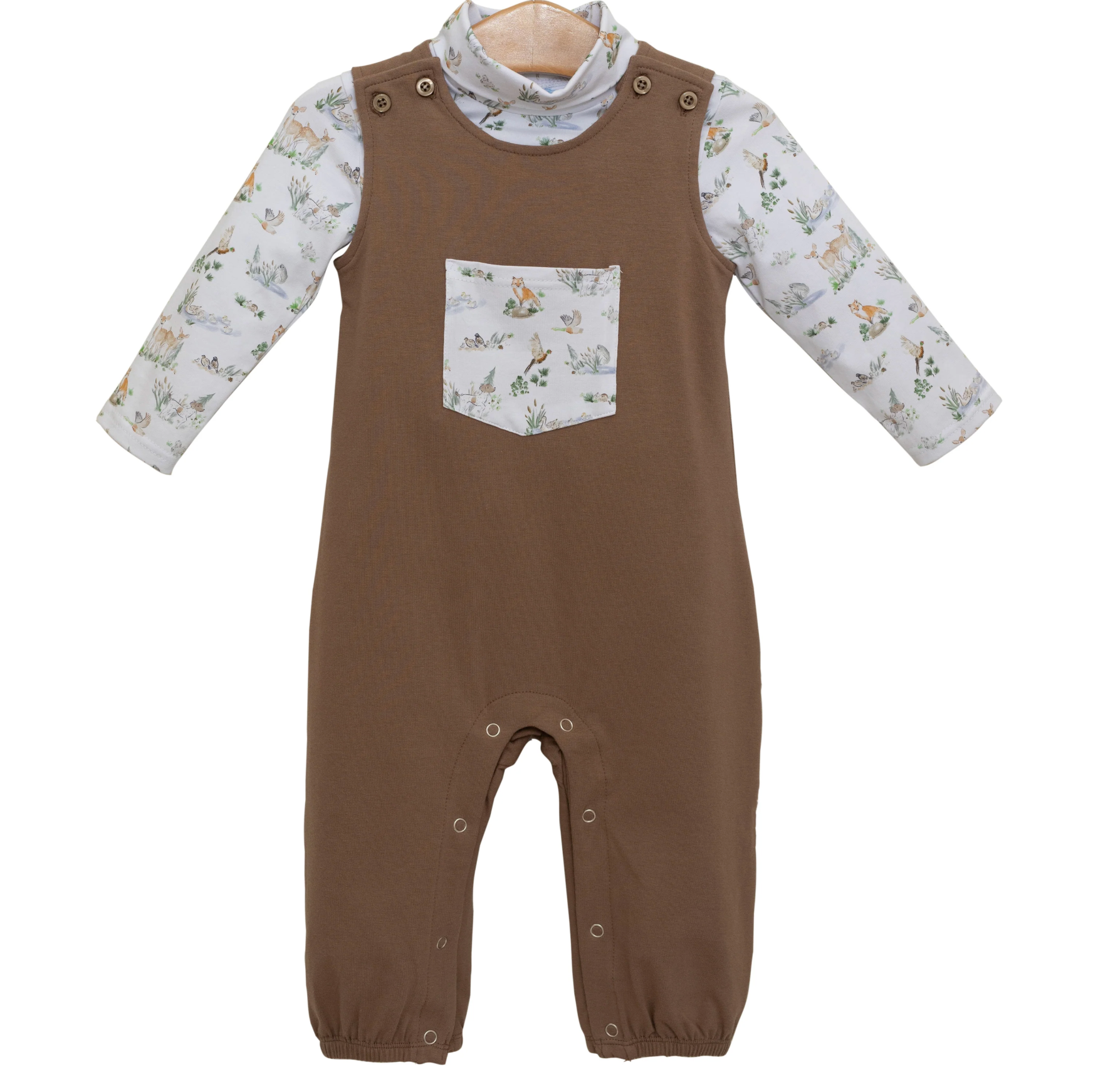 Cozy winter style meets playful charm in this two-piece set featuring soft brown cotton overalls adorned with a woodland friends print pocket. The matching long-sleeved turtleneck completes the look with coordinating woodland graphics. Designed for baby boys in size 18 months, the natural warmth of cotton keeps little ones comfortable through chilly months. Perfect for holiday gatherings, playdates, or everyday adventures—this set combines durability with adorable character appeal that parents love.