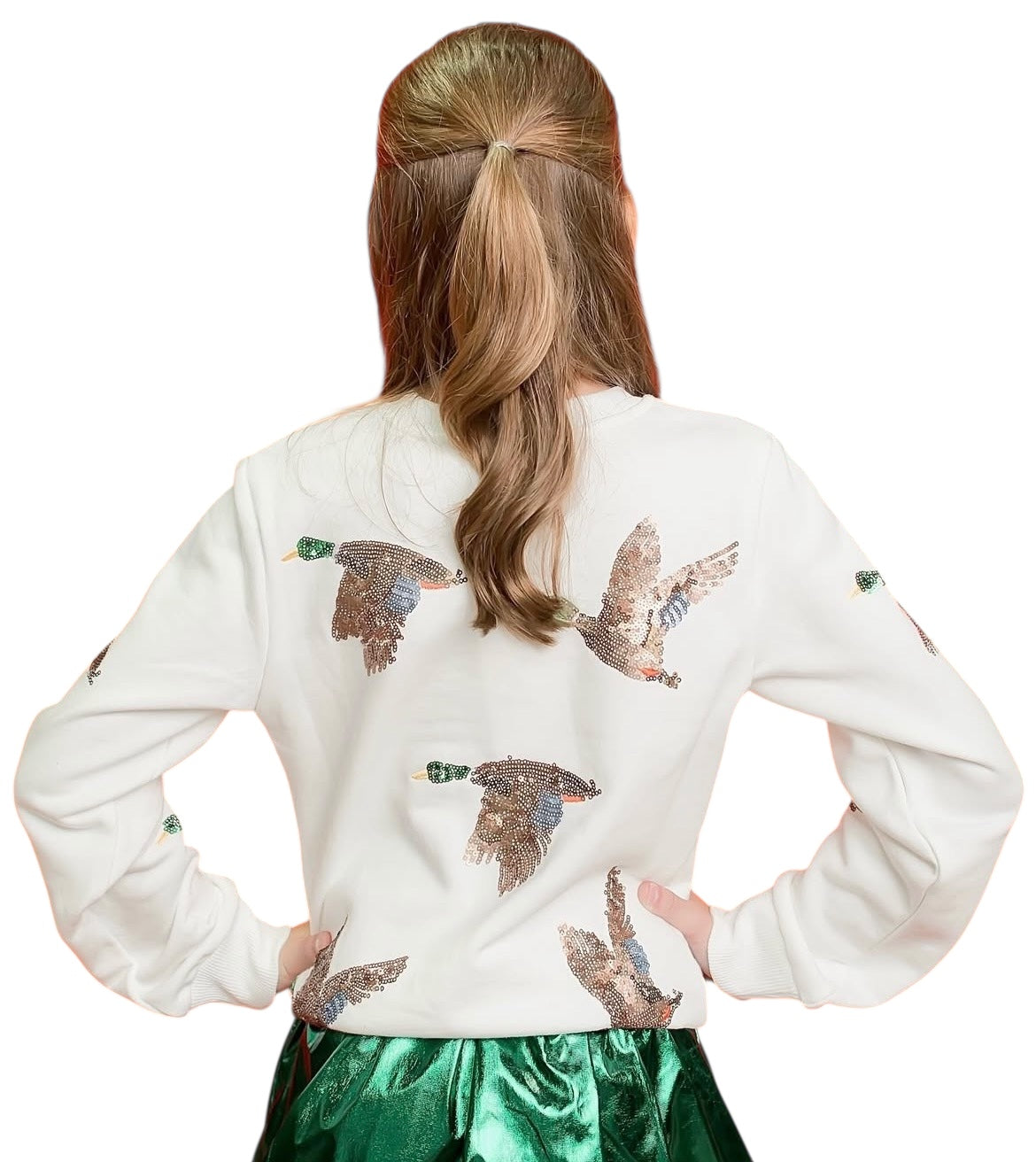 Elevate casual elegance with this white sweatshirt featuring exquisite mallard ducks crafted entirely from shimmering sequins. The refined design blends comfort with artistic detail, making it a standout piece for sophisticated wardrobes seeking a subtle statement. Perfect for layering, it offers both style and a touch of playful luxury.