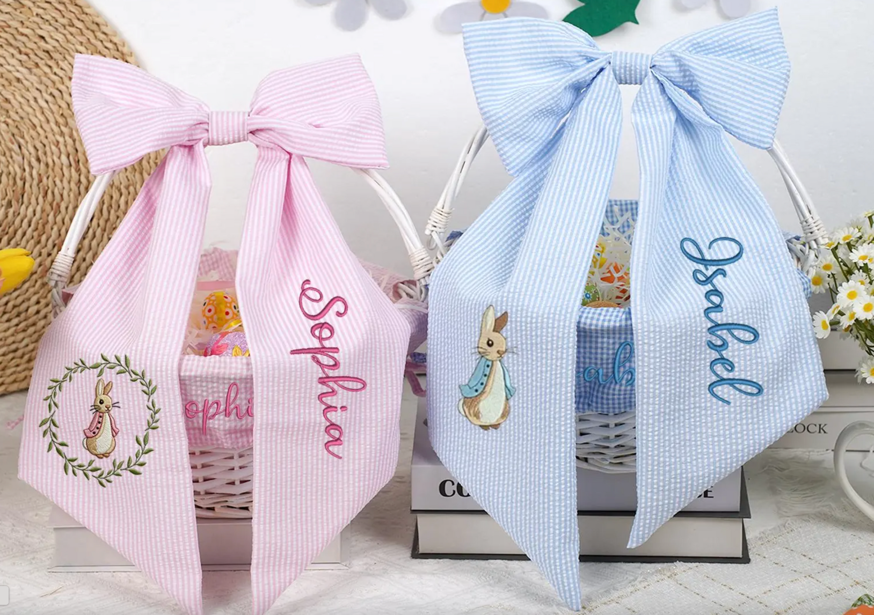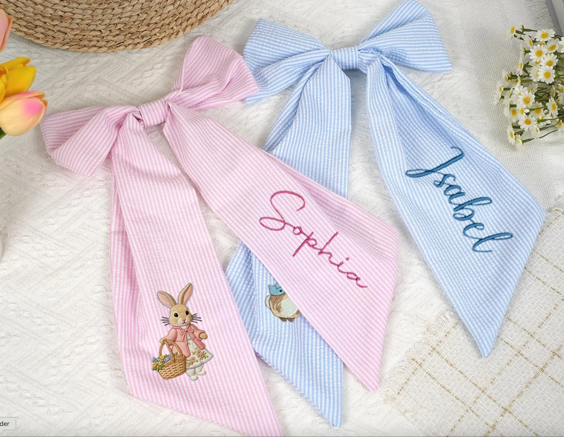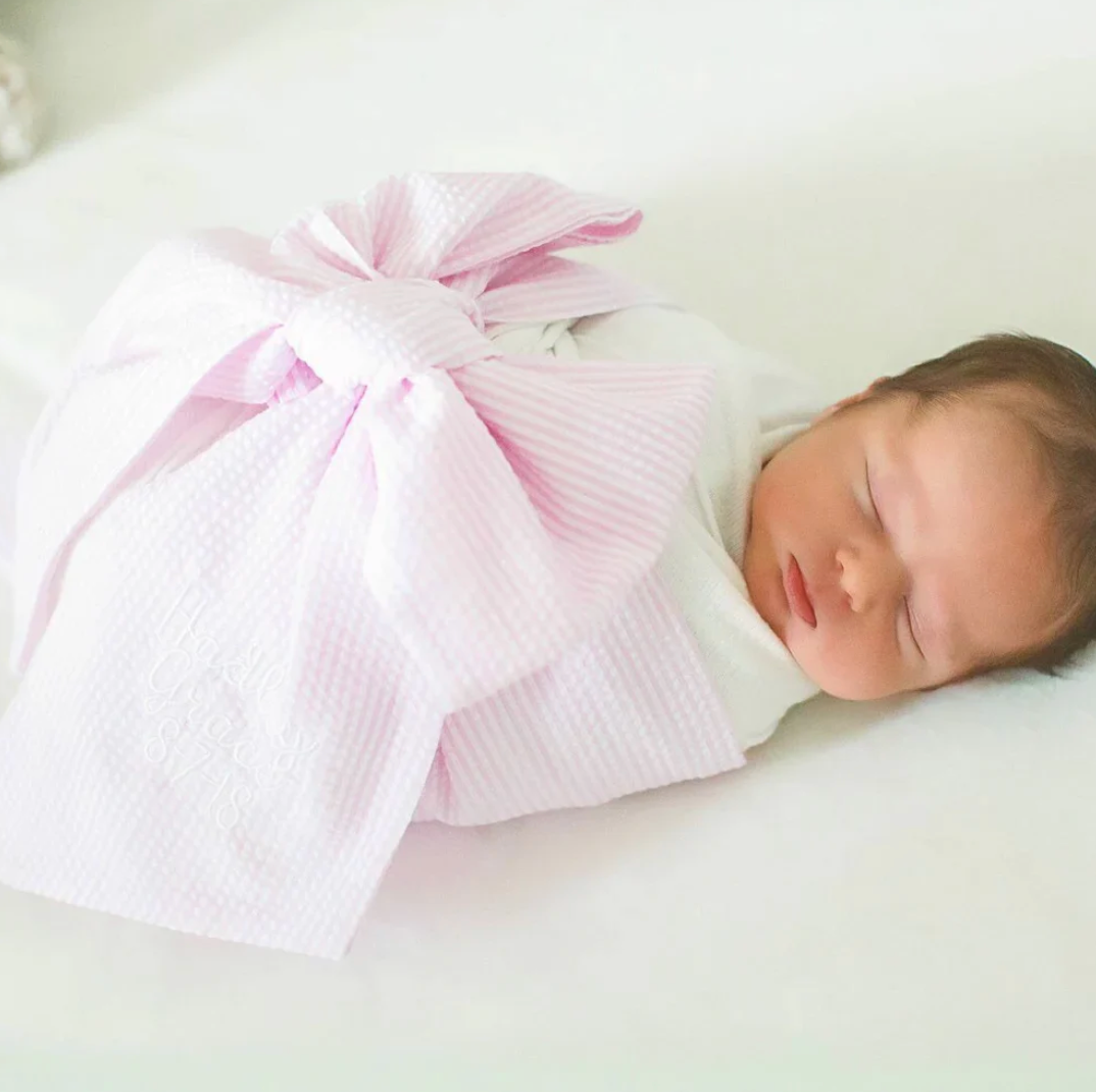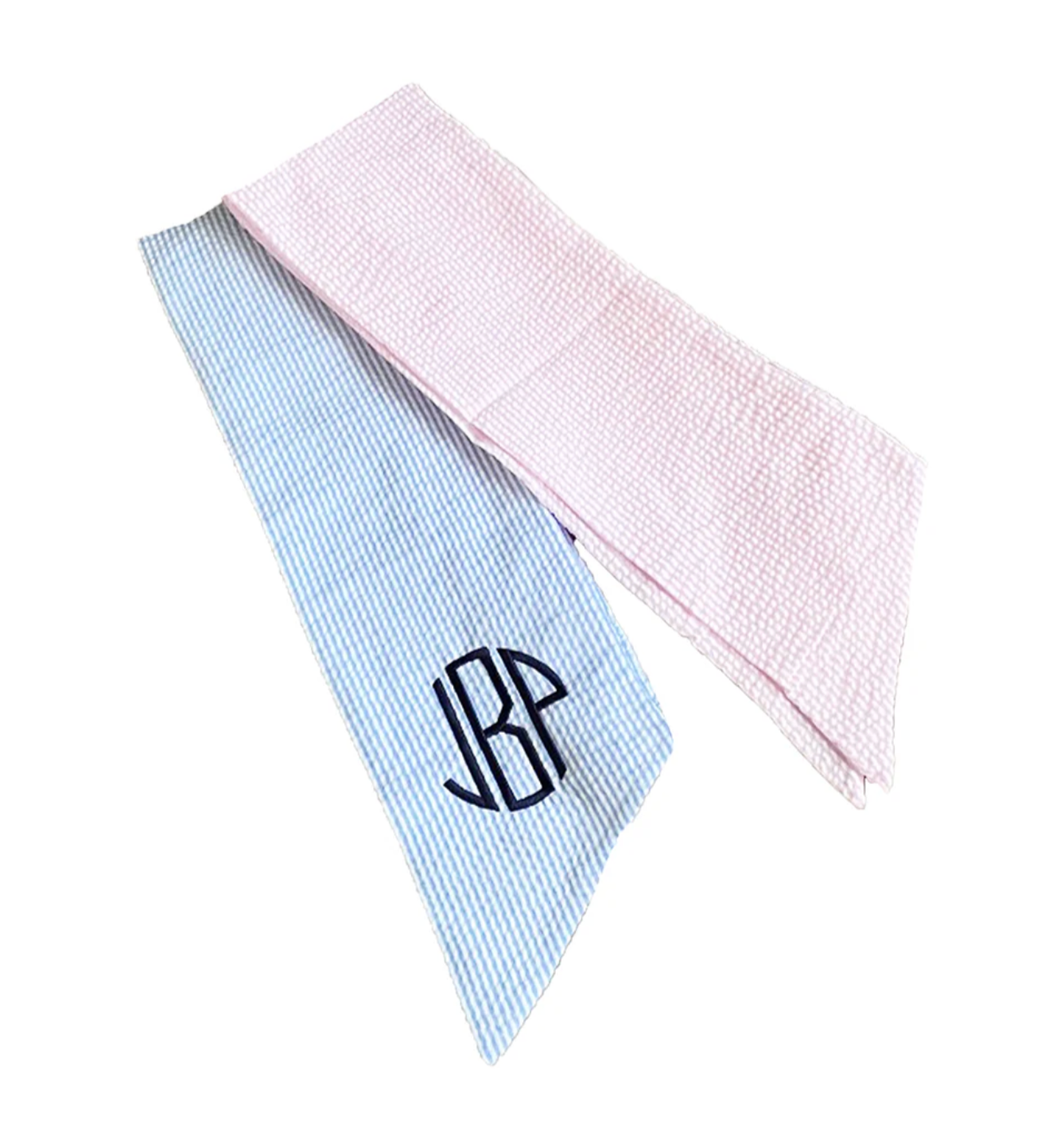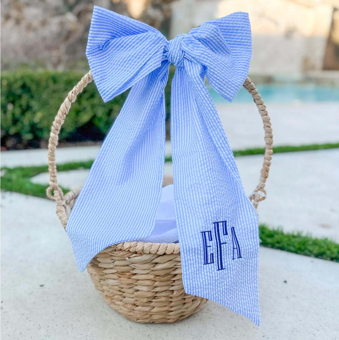 Transform any occasion with this versatile seersucker sash. Perfect as a wreath accent, Easter basket embellishment, or delicate newborn swaddle drape, this blank canvas adapts to your needs. Choose between blue or pink seersucker for timeless appeal. Elevate your sash with a custom monogram for $20—simply reach out to LillyJaceKids@gmail.com to personalize yours.