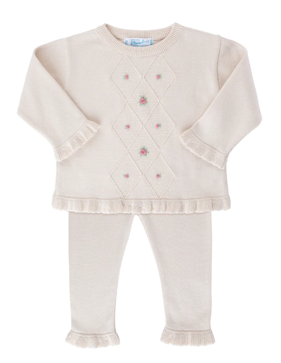Looking for a vintage style outfit for your little girl? This adorable knit set is designed with that heirloom look in mind - perfect for creating lasting family memories! Made in a timeless ecru color that's always a classic, with argyle knit and dainty, hand-stitched rosebuds, for a quality guaranteed to withstand the tests of time.