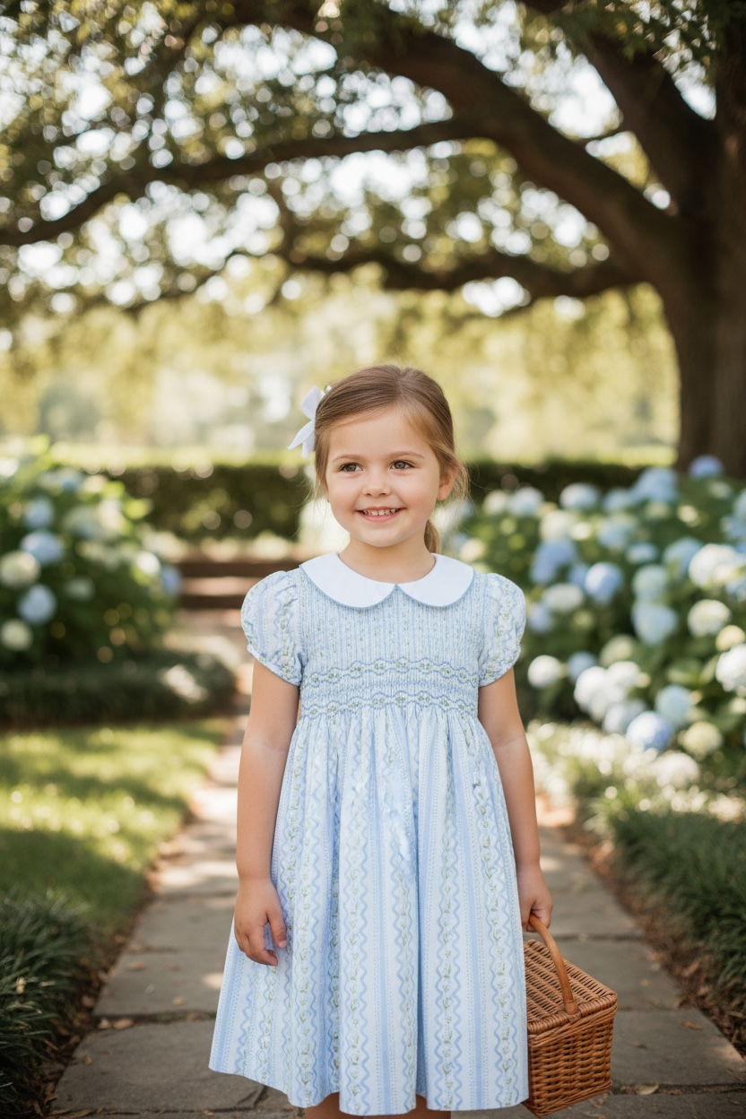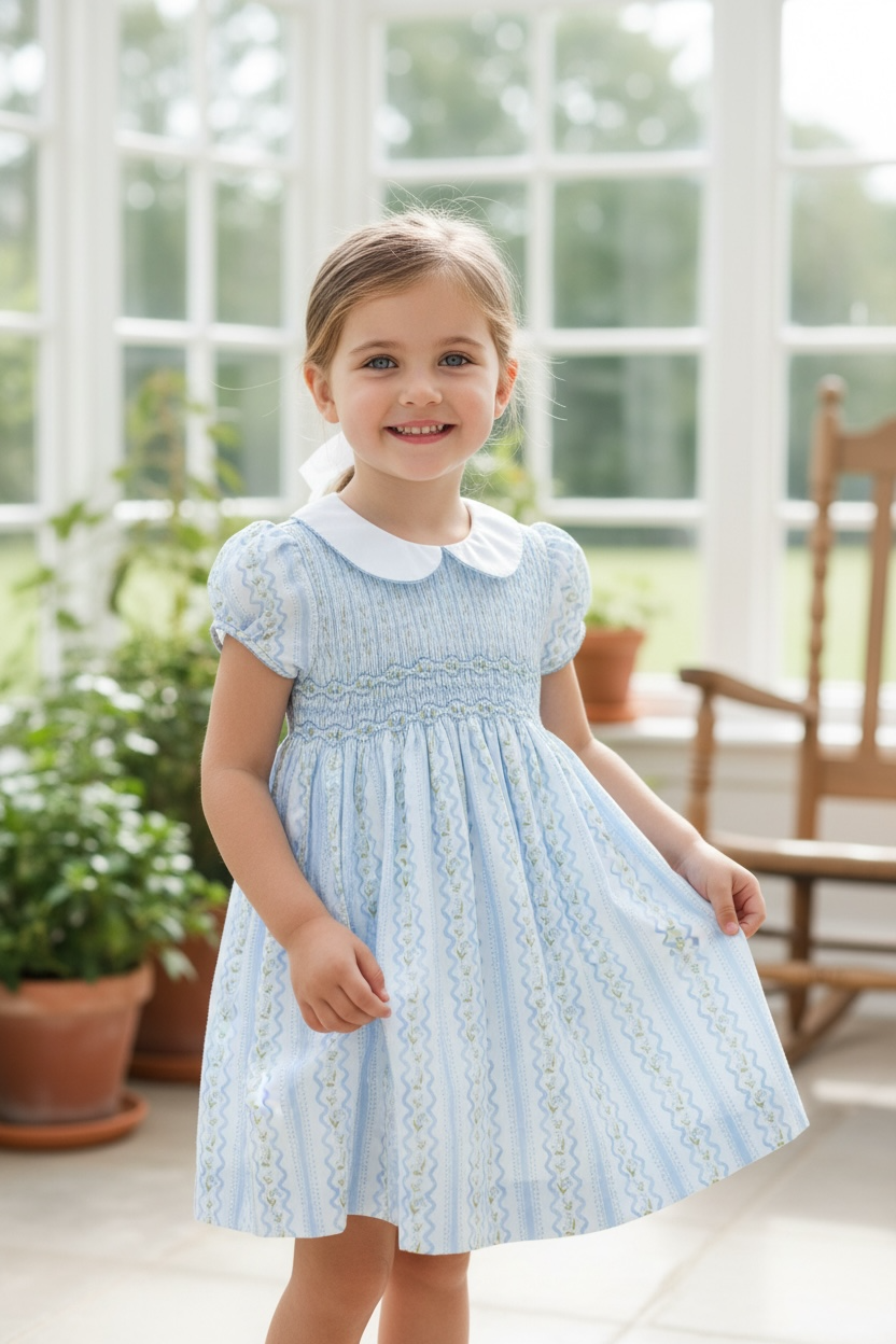 Embrace timeless elegance with the Blue Smocked Lily Floral Dress by Ruth and Ralph. Featuring a delicate winter lily pattern in serene shades of blue. Crafted from a soft, durable 65% polyester and 35% cotton blend, it ensures comfort and lasting wear. Perfect for sunny outings, tea parties, or special celebrations, this heirloom-quality ensemble combines refined style with everyday practicality.