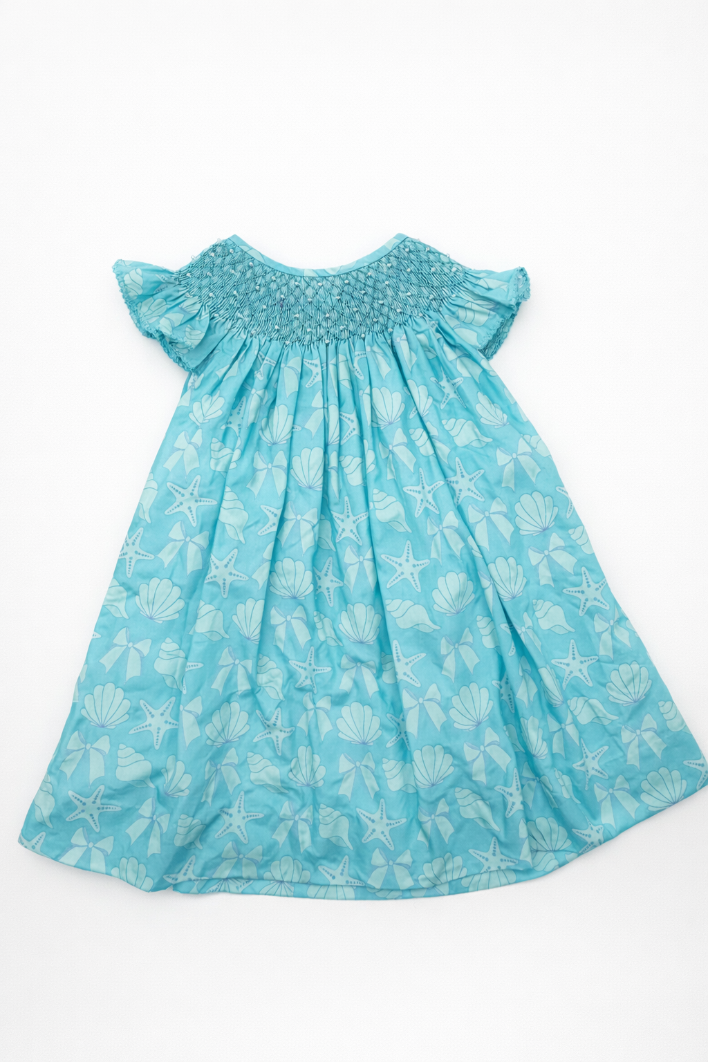 Dive into summer style with this charming Blue Seashore Dress, designed for little ones who love the beach. Featuring delicate smocking detail and a pearl-adorned neckline, this dress showcases playful shell, bow, and starfish motifs that capture seaside magic. Crafted from a soft cotton and polyester blend, it's comfortable for all-day wear and easy to care for with machine-washable convenience. Perfect for beach days, summer outings, or any occasion calling for coastal-inspired charm.