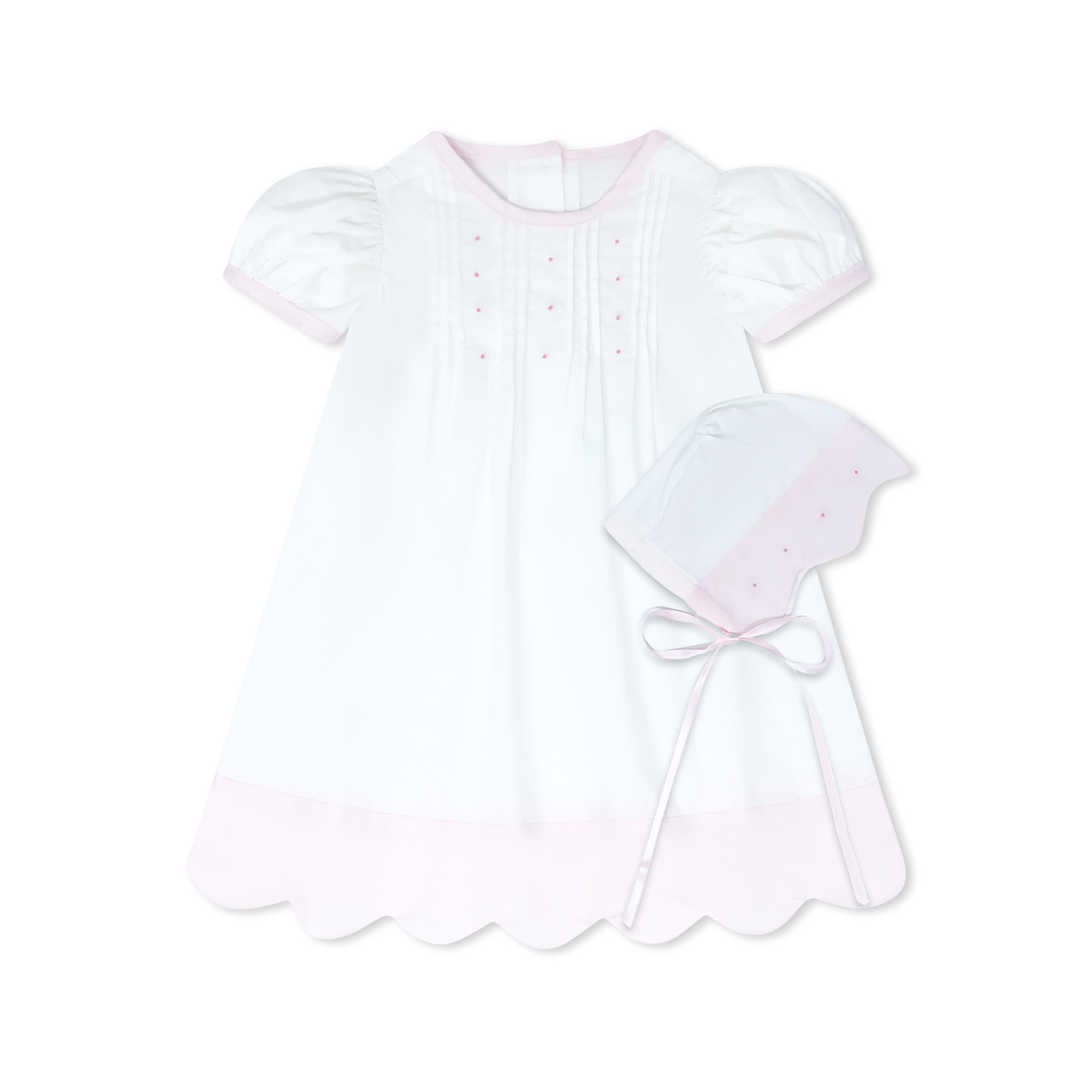Introduce your little one to timeless elegance with this 1956-inspired Daygown and bonnet set. Crafted in soft scallop batiste with delicate white and pink details, this heirloom piece captures classic charm perfect for newborn portraits, christenings, and cherished celebrations. Each carefully designed element reflects understated sophistication, creating a keepsake garment meant to be treasured and passed down through generations.