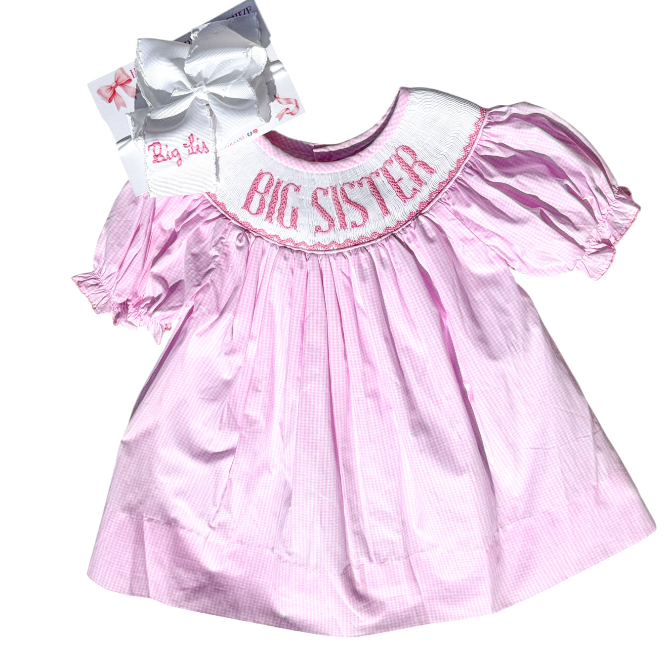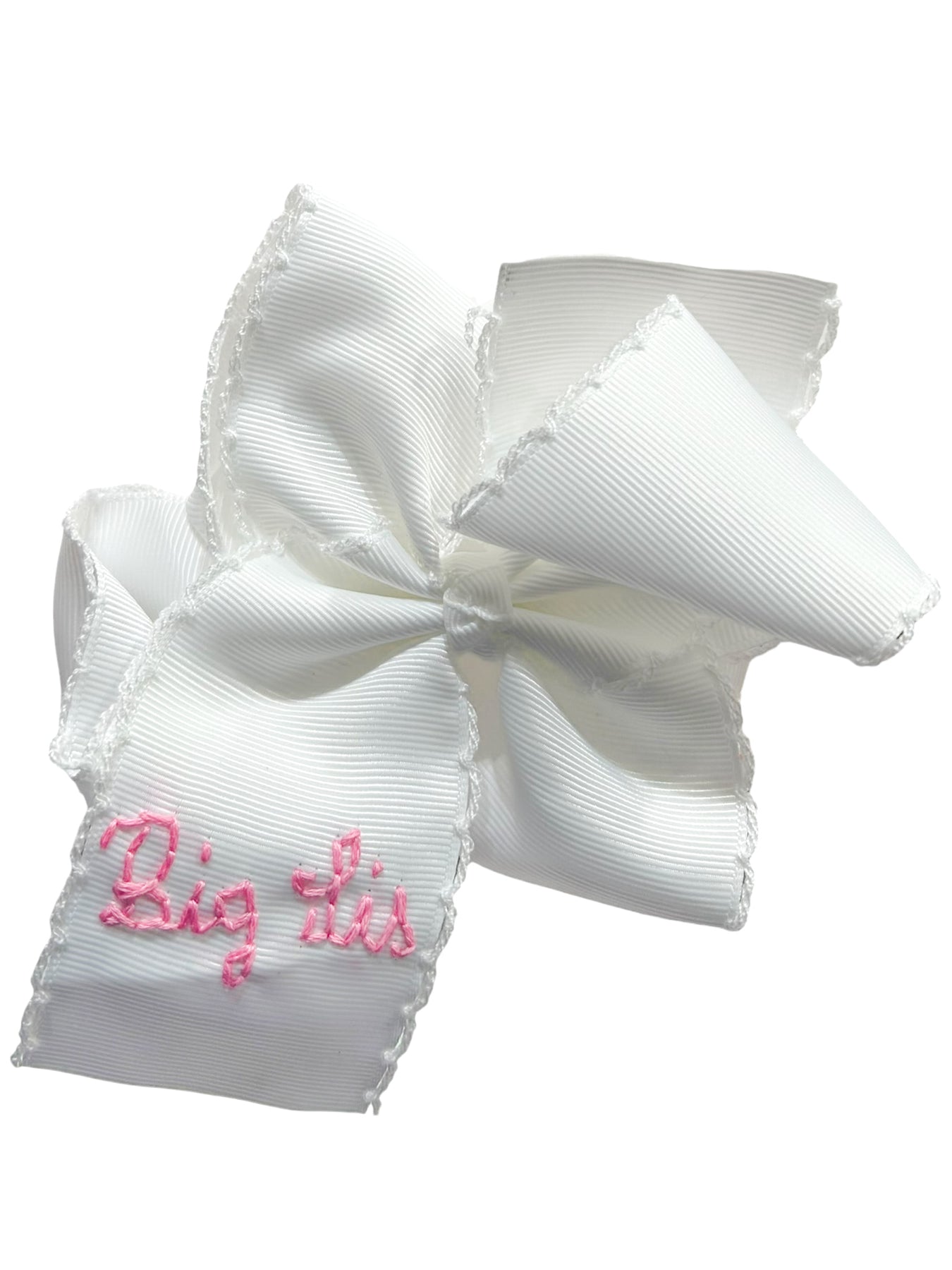 Celebrate your little one's big milestone with this charming headband bow. Featuring a soft white base with delicate moonstitch detailing, it's adorned with "Big Sis" hand-stitched in sweet pink thread. Perfect for toddlers under 2 years old, this gentle accessory lets her proudly announce her new role. A thoughtful gift or keepsake for this special transition.