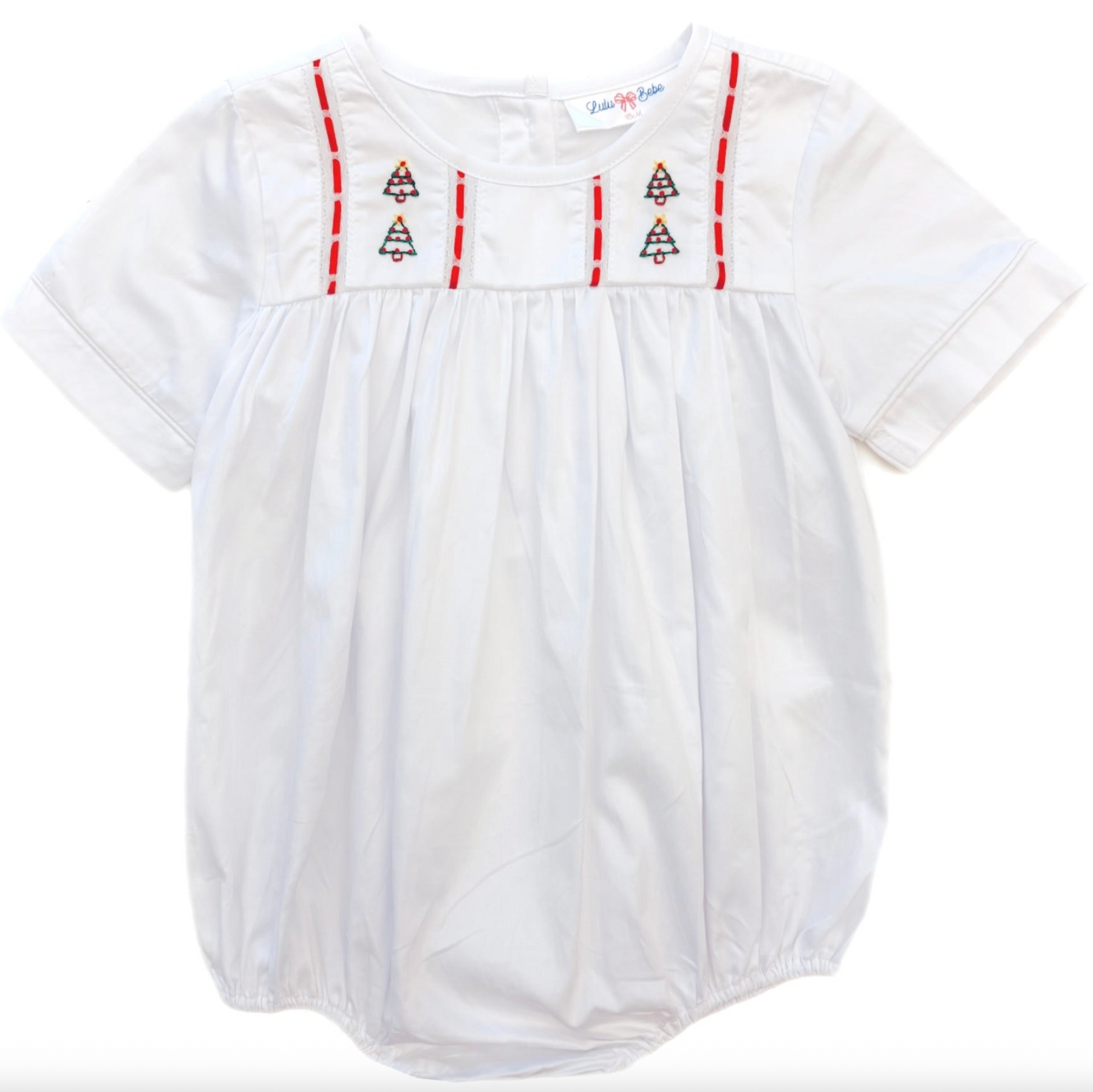 Crafted for timeless holiday elegance, this Boys Christmas Heirloom Bubble by Lulu Bebe features a crisp all-white design adorned with delicately embroidered Christmas trees on the chest. Finished with subtle red ribbon accents, it offers a refined and classic look perfect for sophisticated heirloom portraits that capture the spirit of Christmas year after year.