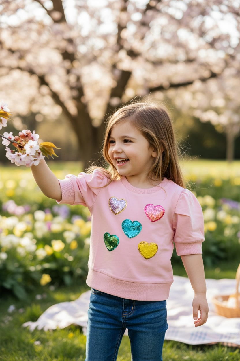 This puff sleeve blouse features eye-catching sequin rainbow hearts on the front with non-irritating sequins for all-day comfort. Perfect for spring and summer wear, it's the versatile piece every girl needs in her closet.