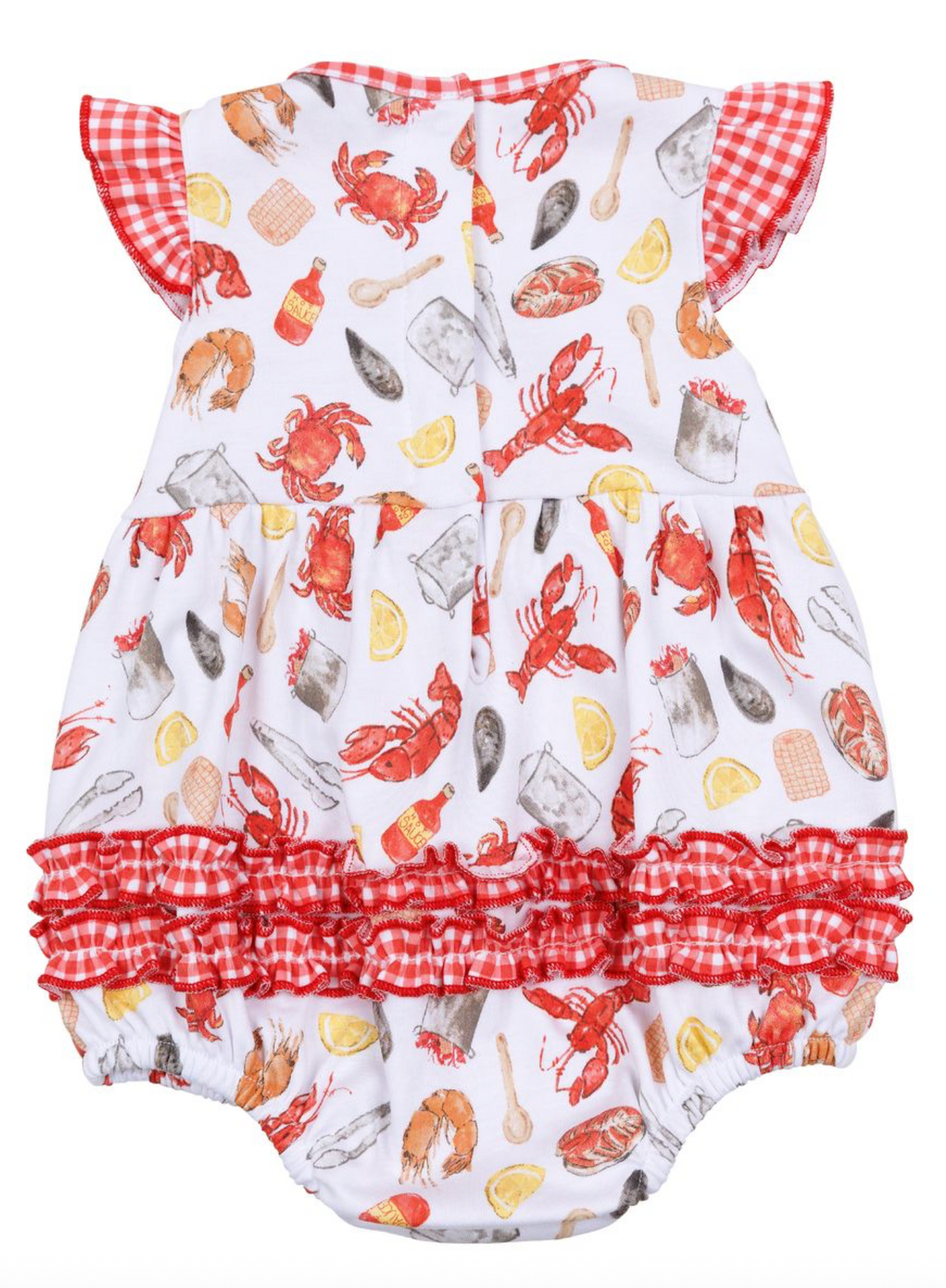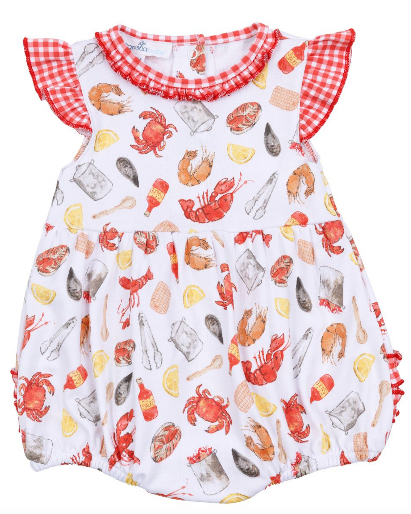 Bring Southern charm to your little one's wardrobe with this delightful crawfish boil bubble! Crafted from soft, breathable pima cotton, this playful piece features whimsical angel sleeves and adorable ruffles cascading down the back—because every crawfish boil needs the cutest guest in attendance. Perfect for family gatherings, casual outings, or making a splash at any celebration. Your baby girl will steal the show in this charming design!