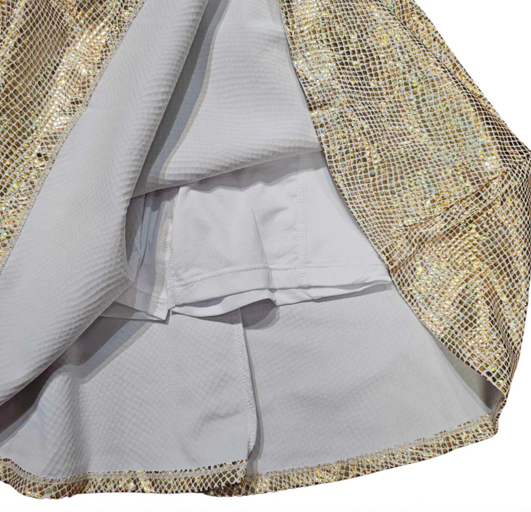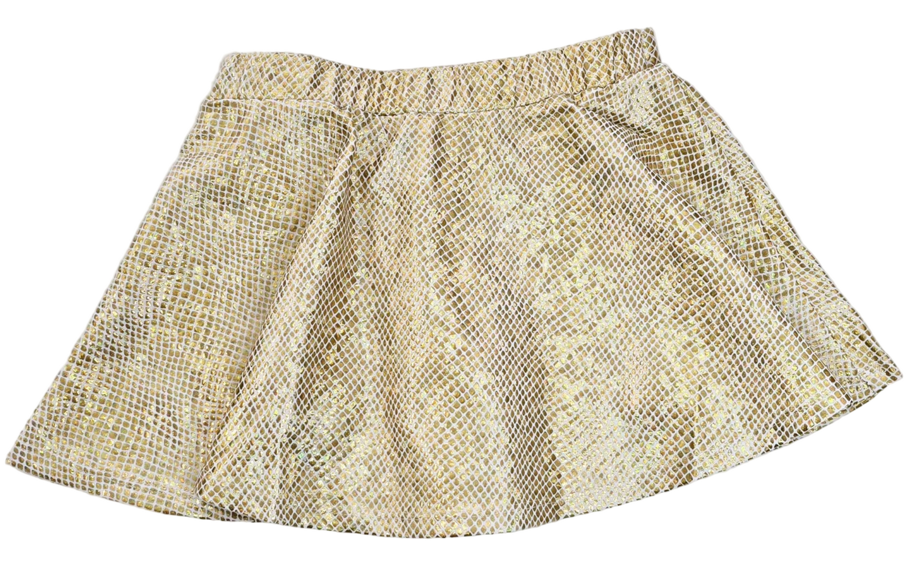 Introduce her to pure shimmer with the Lulu Bebe Metallic Gold Skort—a show-stopping piece featuring an exclusive iridescent snakeskin pattern in golden metallic that's never been done before. Perfect for Mardi Gras celebrations or any moment she wants to sparkle, this skort catches light beautifully with every move. The soft lining and elastic waistband keep her comfortable all day, whether she's playing or heading to a special event. Parents appreciate how easily it transitions from casual to celebration-ready.