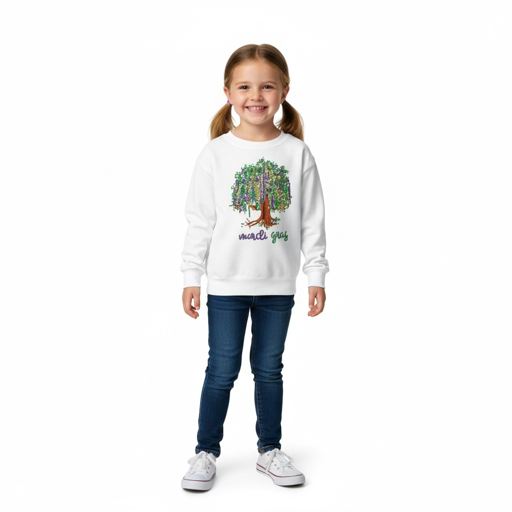 Celebrate the magic of Mardi Gras with this charming white long-sleeved shirt featuring a shimmering sequin willow tree adorned with colorful beads—a beloved New Orleans tradition brought to life. Perfect for capturing that festive spirit, this piece lets your little one shine during the season's most iconic celebrations. The eye-catching design combines playful sparkle with timeless holiday charm, making it an instant favorite for parades, parties, and memories in the making.