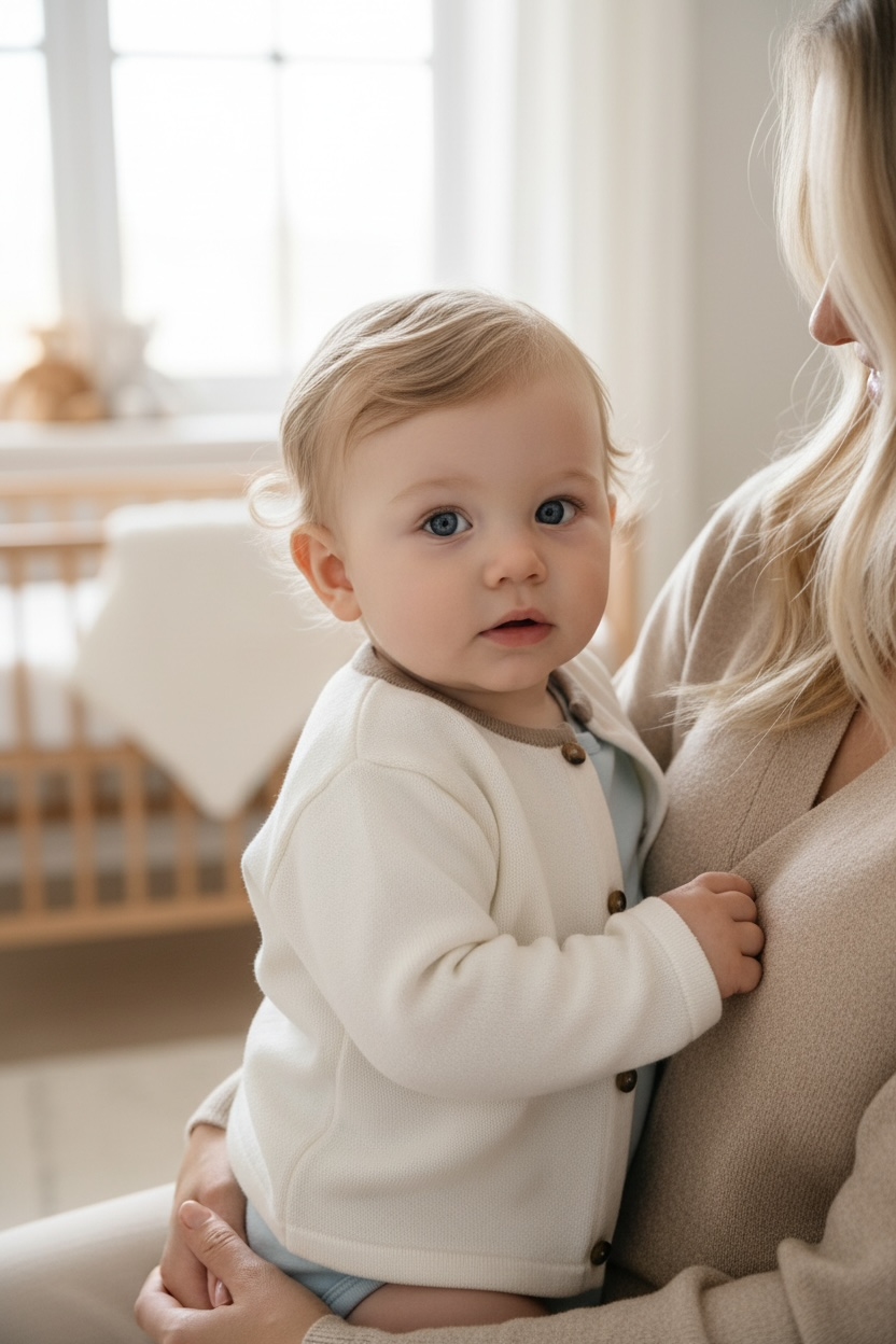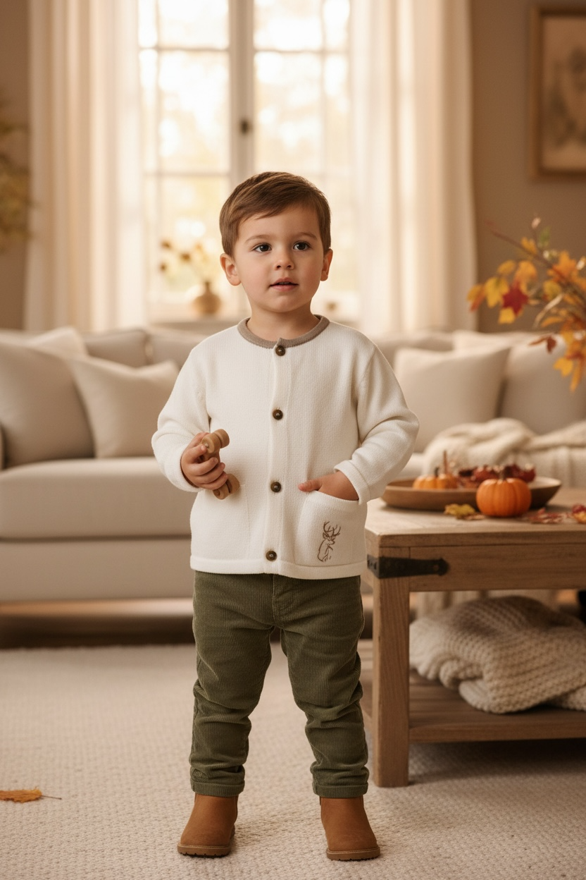 The Burrow Button Down is a classic layering piece with a touch of timeless charm. Knit in soft ivory with Kingsport Khaki trim and buttons, this sweater features a front pocket adorned with delicate deer embroidery. A versatile style, perfect for cooler days, family gatherings, and holiday portraits.