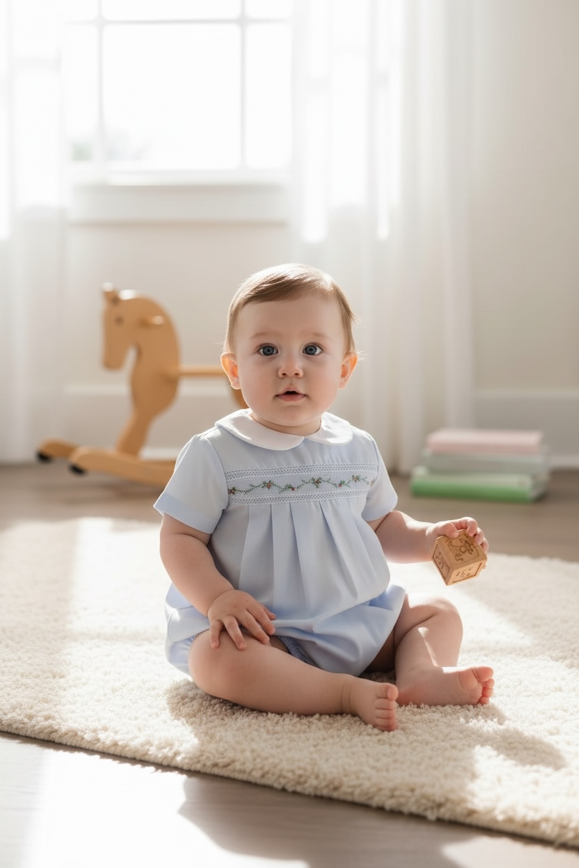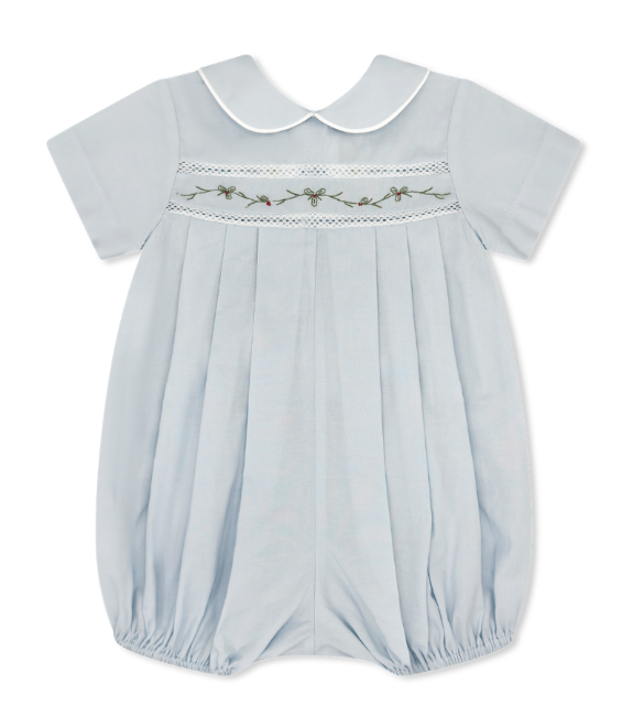 Classic and festive, the Graham Bubble is crafted in soft Boston Blue Batiste with delicate holly embroidery across the chest. Featuring a crisp Peter Pan collar piped in white, this heirloom-inspired bubble is designed for little boys and perfect for holiday gatherings, family portraits, or special occasions.