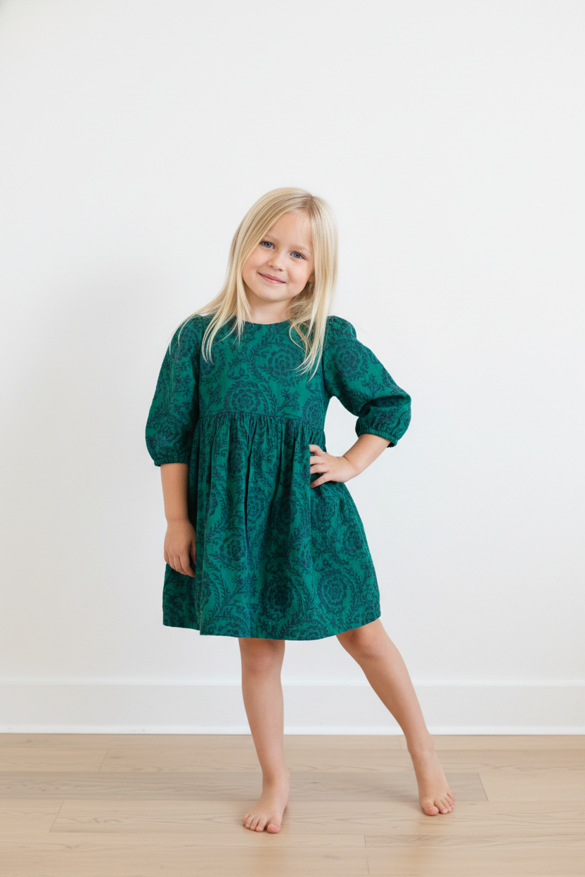 Collection Classic! Whether covered in a field of Fall flowers or a swirling embroidered floral, our classically tailored Girls Brooke Dress is ready for anything and everything this season. Signature details include a rounded neck, twirl worthy full skirt, gathered puff sleeve and glitter buttons at the back. Available in this Fall's fabulous patterns, Evergreen with Navy Embroidery, Inca Gold with White Embroidery and our shimmery Autumn Flowers.