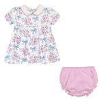 Adorable blue and pink floral bows print dress designed for baby girls who love charming details. Crafted from soft, breathable luxury pima cotton that's gentle on delicate skin. The dress features a coordinating pink bloomers set included, ensuring complete coverage and comfort for active little ones. Perfect for special occasions or everyday wear, this piece combines style with the premium quality your baby deserves.