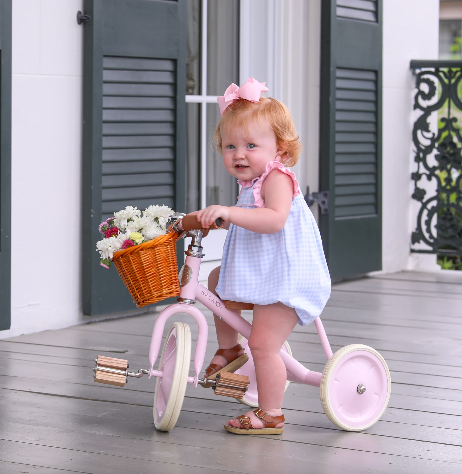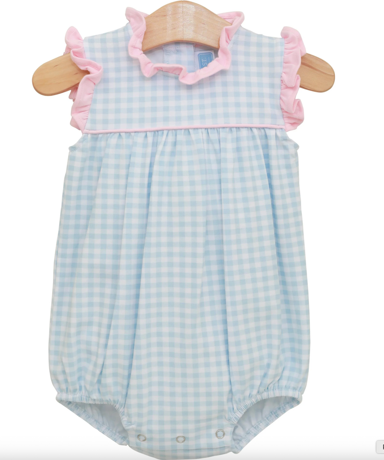 Springtime sweetness meets playful style in this charming bubble featuring a beautiful light blue gingham print and delicate pink ruffle trim. Perfect for baby girls who love a touch of charm, this piece captures the essence of the season with its fresh color palette and feminine details. The soft gingham pattern pairs beautifully with the ruffled accents, creating a look that's both classic and contemporary. Ideal for photos, playdates, or everyday adventures.