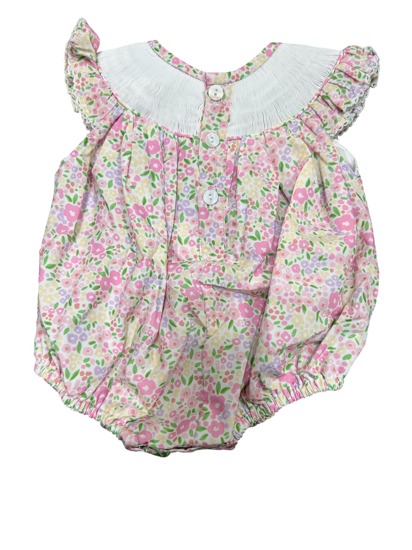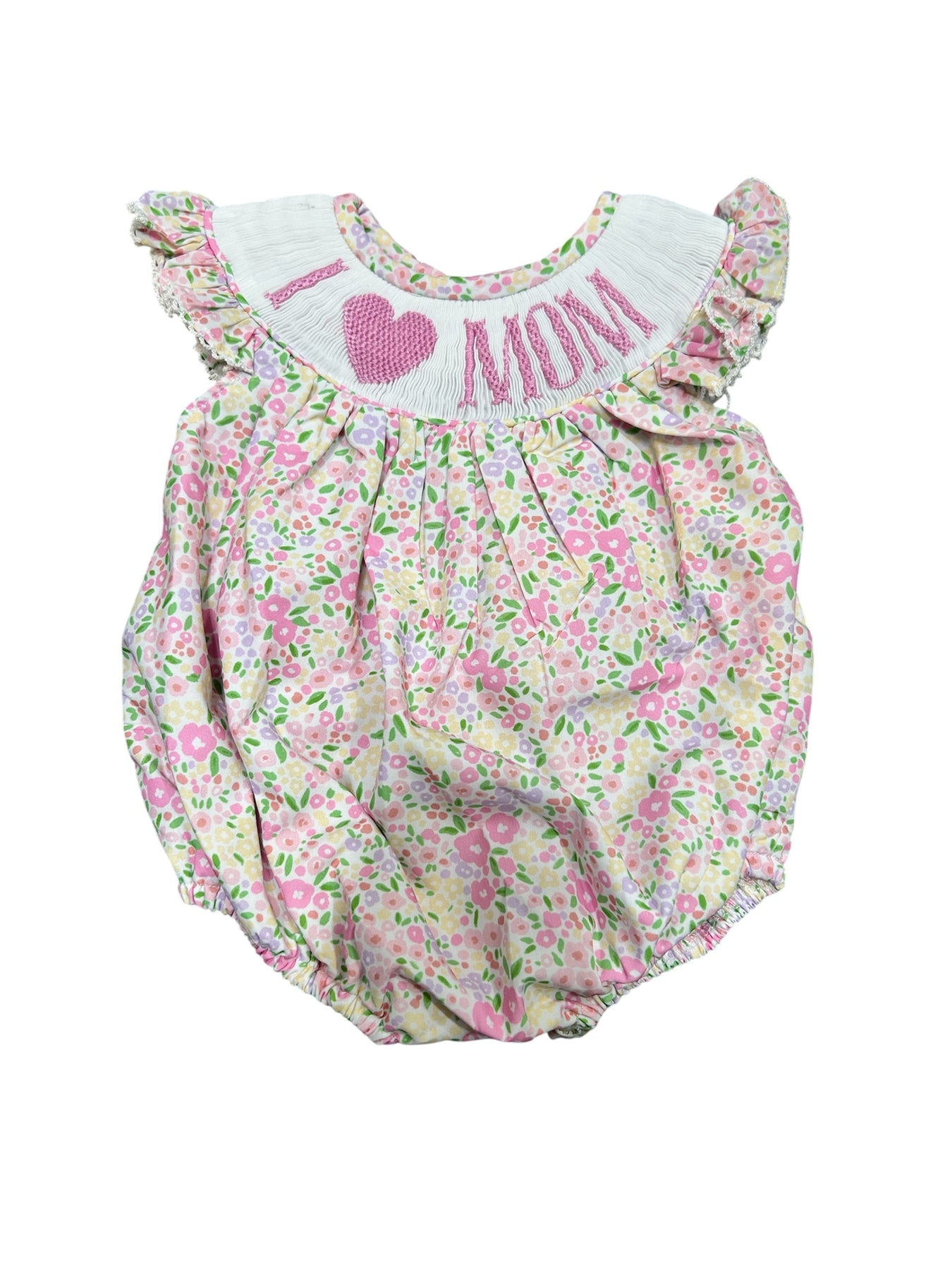Caroline Floral "I Love You Mom" Bubble features charming smocking details and a delicate floral print that celebrates the special bond between mother and child. This sweet bubble romper showcases an "I love you mom" message, making it perfect for Mother's Day gifts, family photos, or everyday wear. The classic bubble silhouette offers comfort and ease of movement for active kids, while the thoughtful design creates a meaningful keepsake. Ideal for creating precious moments with mom.