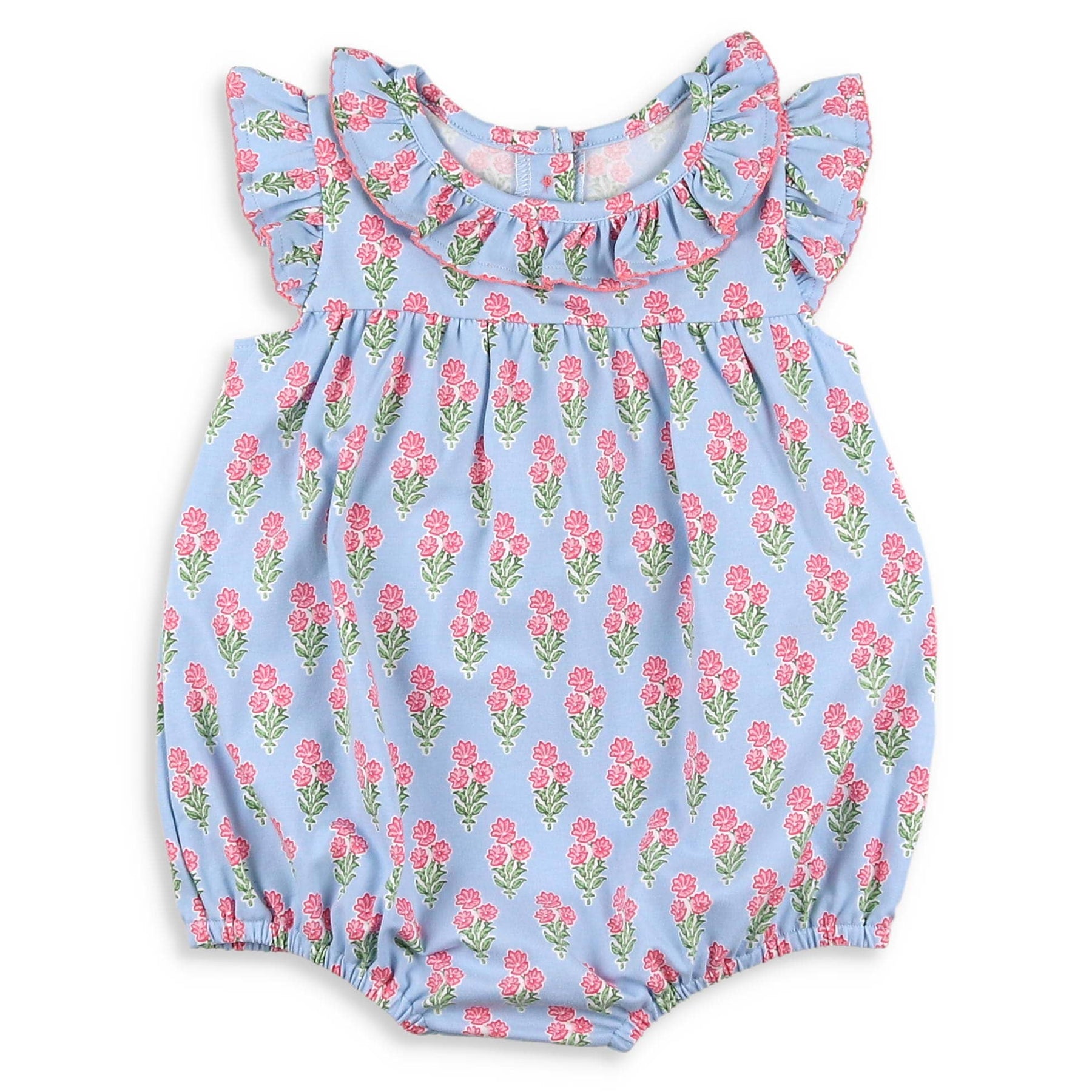Brighten your baby girl's warm-weather wardrobe with the Coral Bouquet Bubble from Serendipity. This charming outfit pairs a vibrant coral floral print against soft periwinkle blue, accented with a delicate coral serge ruffle collar and ruffled sleeves. Practical back buttons make dressing effortless, while the playful design transitions seamlessly from beach days to garden parties and everything in between. Perfect for spring and summer adventures, this bubble is the versatile piece every active child needs.