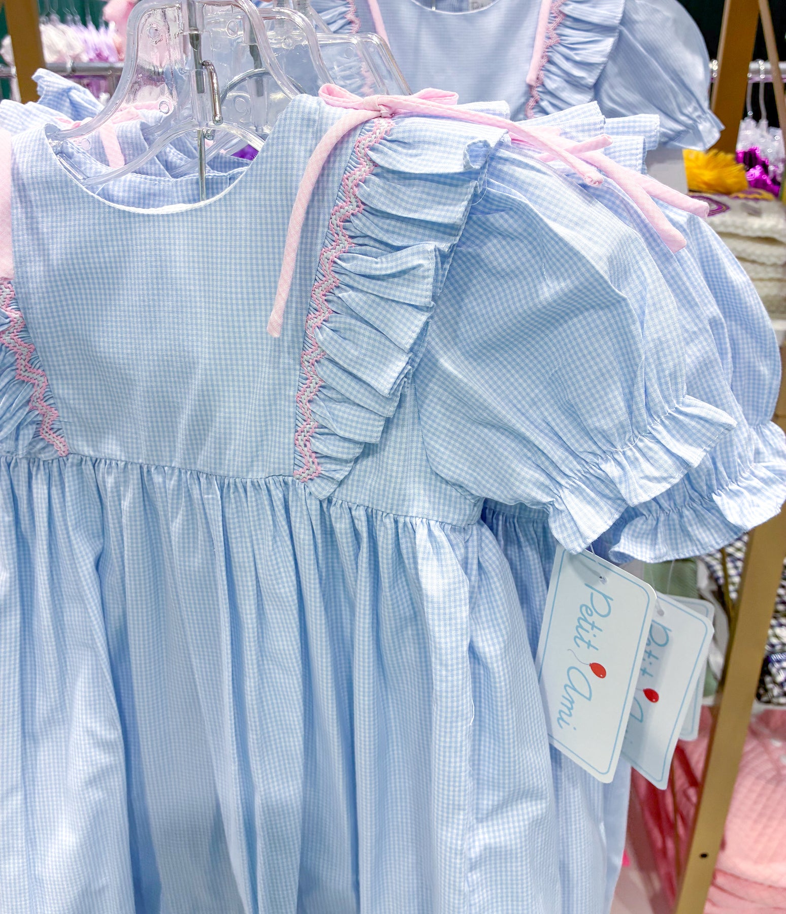 Introduce your little one to timeless spring elegance with this charming gingham ruffle dress by Petit Ami. Crafted in soft blue gingham with delicate pink accents, the dress features coordinating pink gingham bows adorning the shoulders and intricate pink and white smocking that adorns the ruffled chest. Perfect for special occasions or everyday sophistication, this piece combines classic design with refined details that celebrate childhood grace.