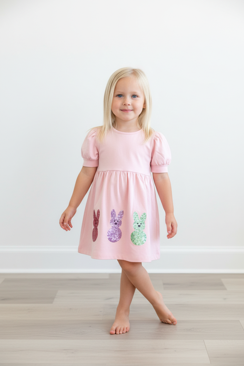Hop into Easter style with this adorable sequin peeps dress! Featuring a soft pink base adorned with colorful sequin peeps dancing across the bottom, this dress is pure springtime magic. Perfect for Easter brunches, family photos, and all those special spring celebrations, your little one will sparkle and shine in glam-worthy style. A playful twist on a holiday classic that'll have everyone smiling!