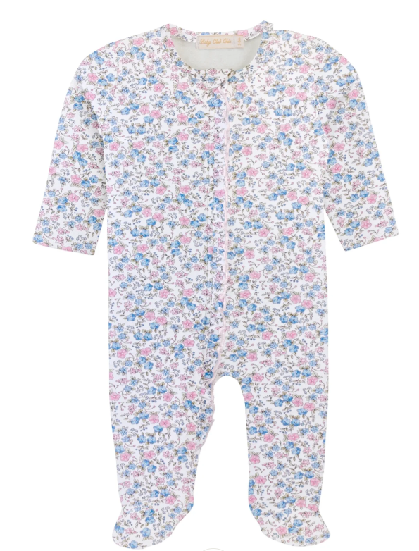 Adorable baby girl footie pajamas featuring delicate floral print throughout. Ruffle accents add a charming touch to this cozy one-piece design. Full-length zipper makes diaper changes and bedtime easy. Soft, comfortable fabric keeps your little one snug all night long. Perfect for playdates or lounging at home.
