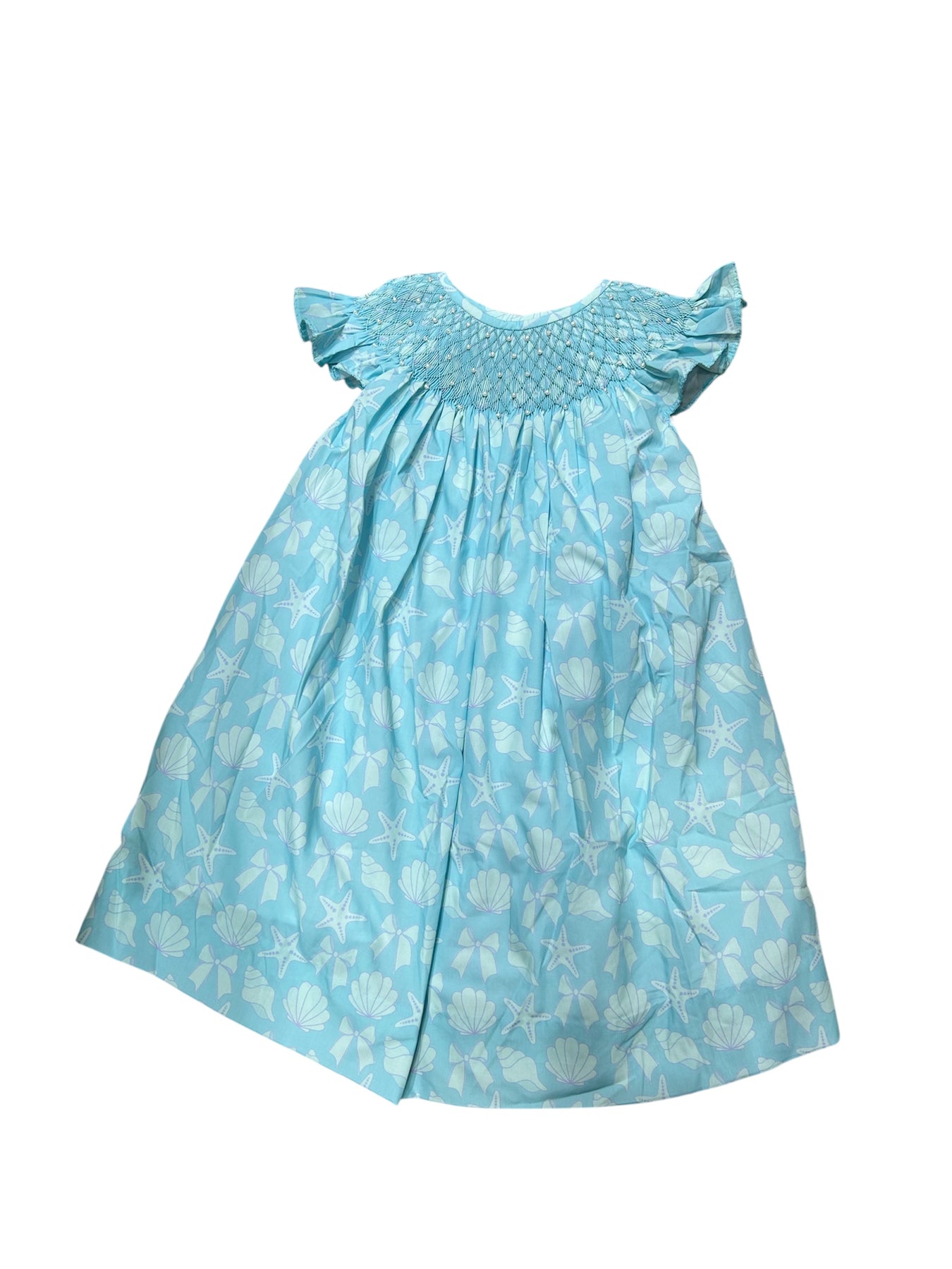 Dive into summer style with this charming Blue Seashore Dress, designed for little ones who love the beach. Featuring delicate smocking detail and a pearl-adorned neckline, this dress showcases playful shell, bow, and starfish motifs that capture seaside magic. Crafted from a soft cotton and polyester blend, it's comfortable for all-day wear and easy to care for with machine-washable convenience. Perfect for beach days, summer outings, or any occasion calling for coastal-inspired charm.