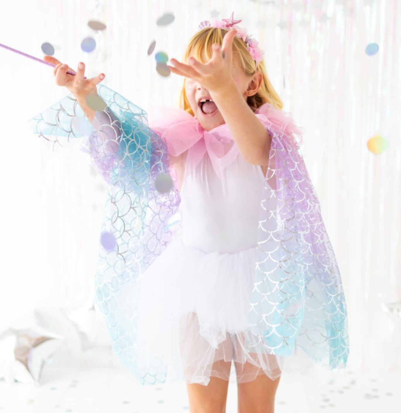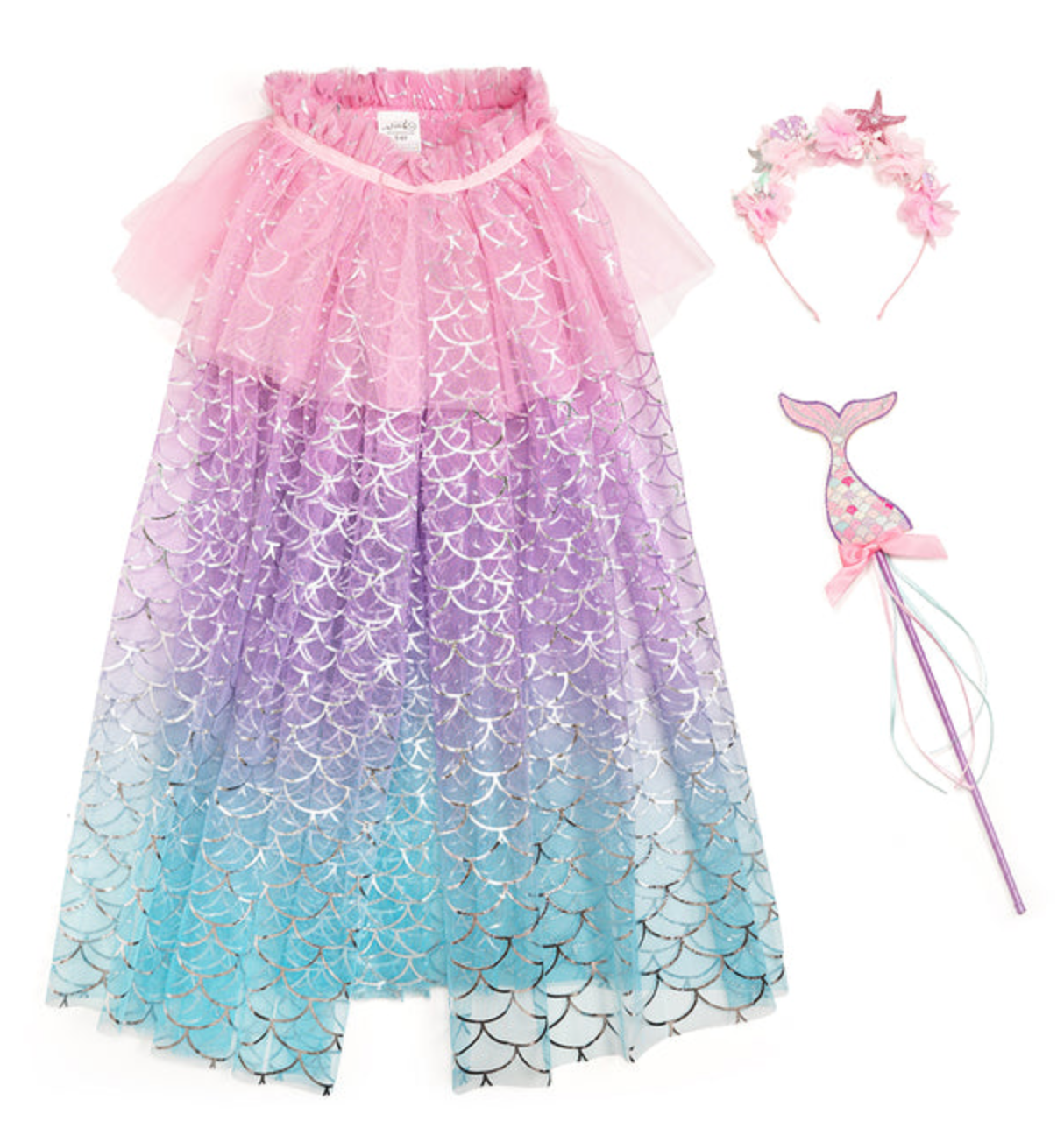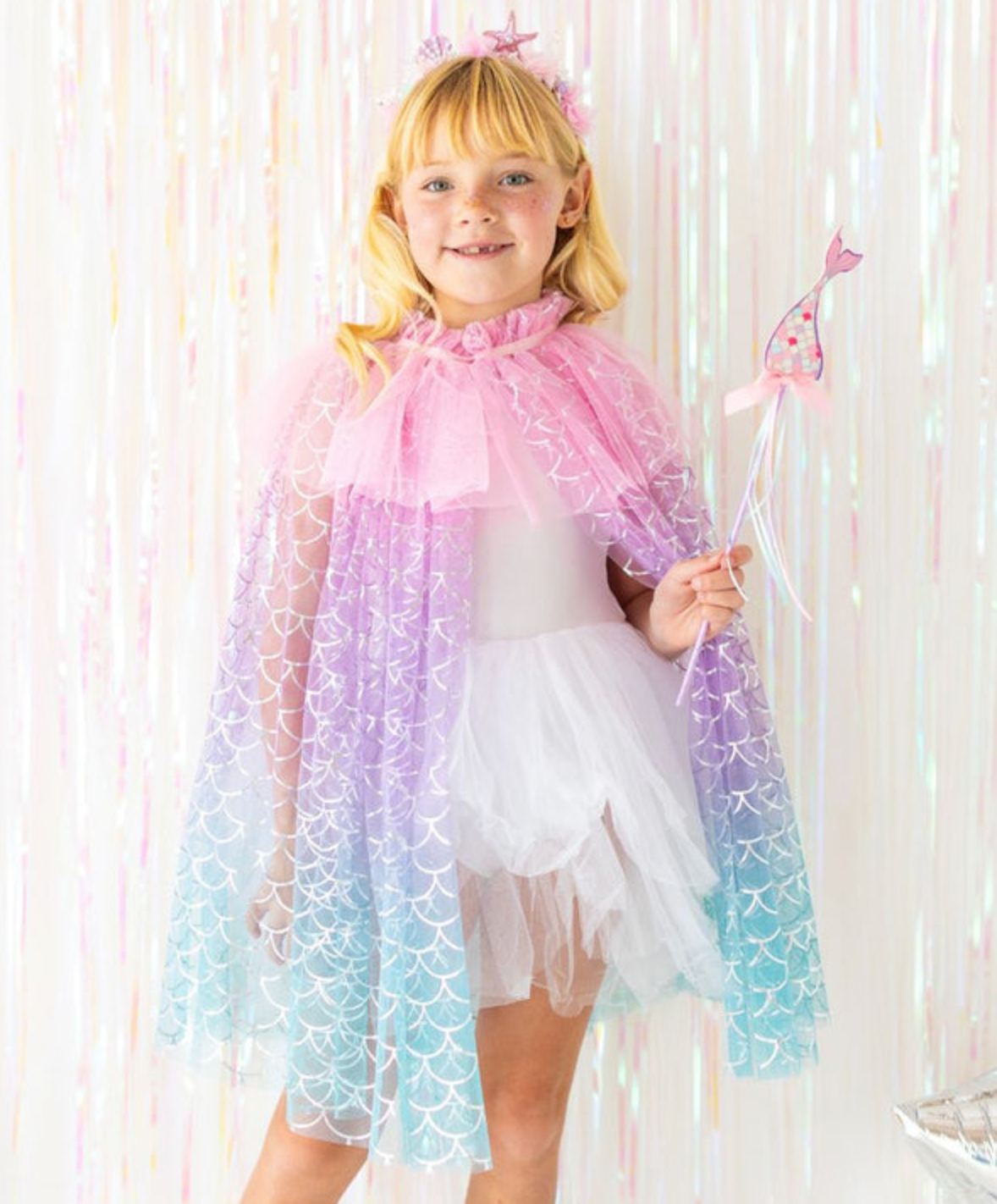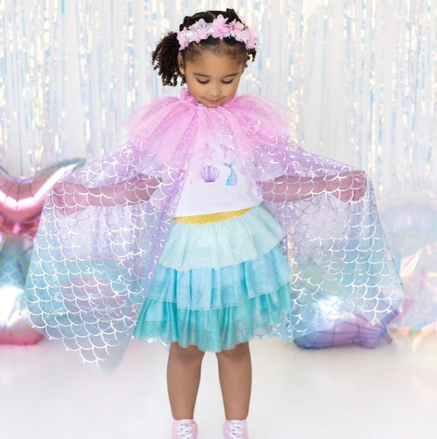 1 Cape: Flowing and lightweight with a holographic scale pattern and soft sparkle, this cape moves beautifully with every twirl and dance. Easy Velcro closure for quick and independent wear.