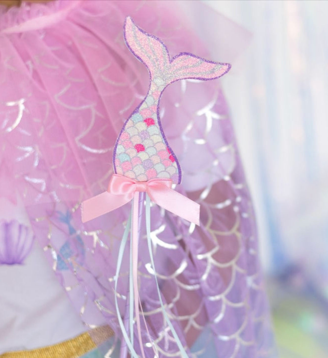 1 Wand: Featuring a mermaid topper and satin ribbon streamers, the wand is perfect for granting wishes, starting stories, and creating mermaid magic.