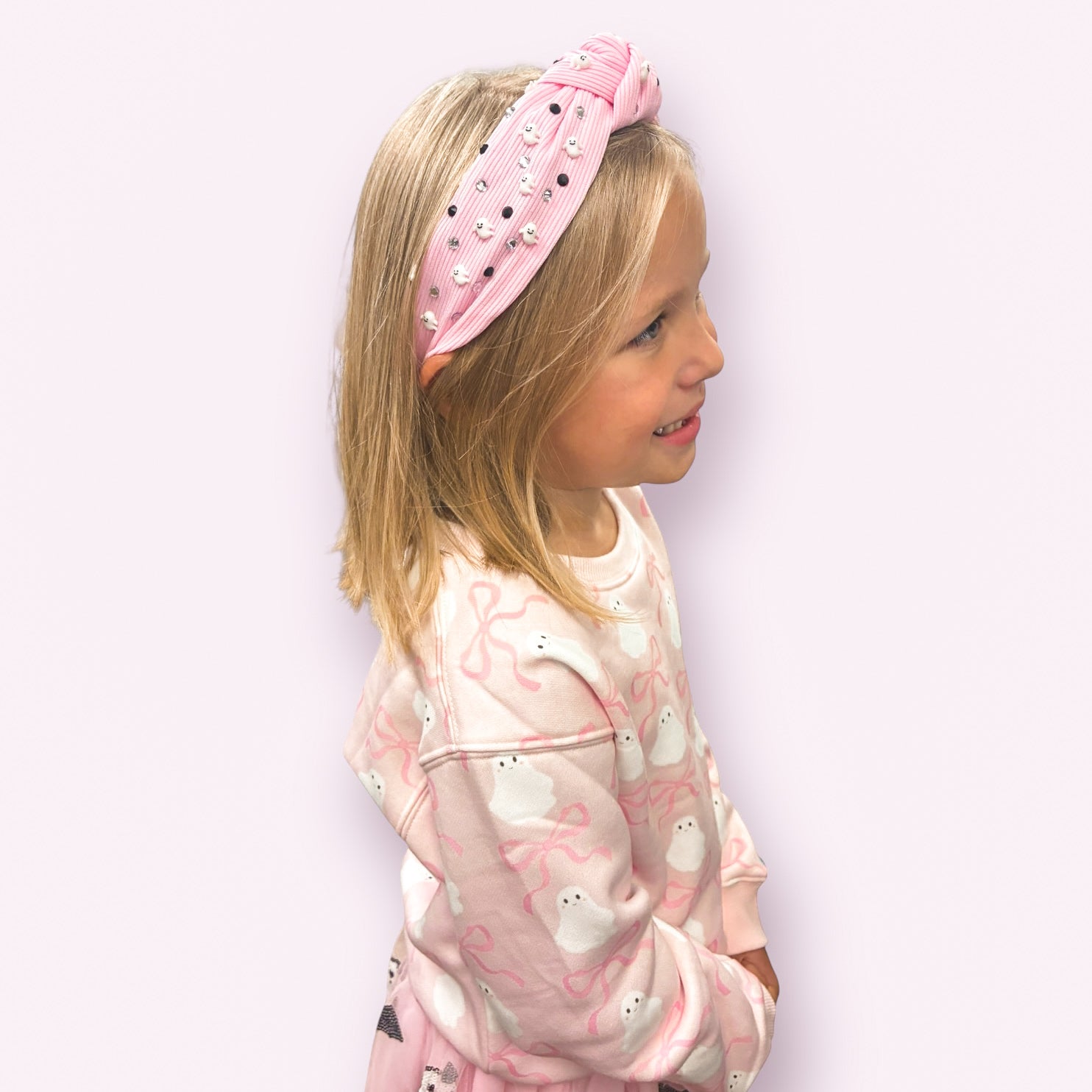 This charming pink headband features high-quality fabric adorned with playful ghost and black rhinestone gemstones, adding a festive sparkle to your child's Halloween outfit. Designed to fit toddlers and kids comfortably, it pairs perfectly with our Pink Spooky Babe Pearl Shirt for a coordinated, adorable look that stands out during the spooky season.