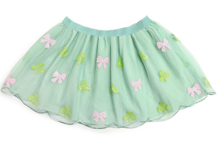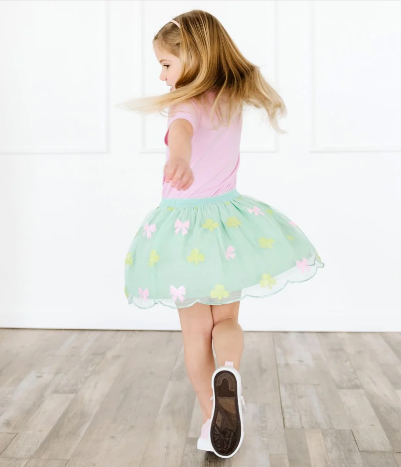 Get ready for some serious St. Patrick's Day twirls in this enchanting mint green tutu, adorned with charming pink sequin bows and sparkling green shamrocks! Your little dancer will feel like the luckiest charm in the parade.