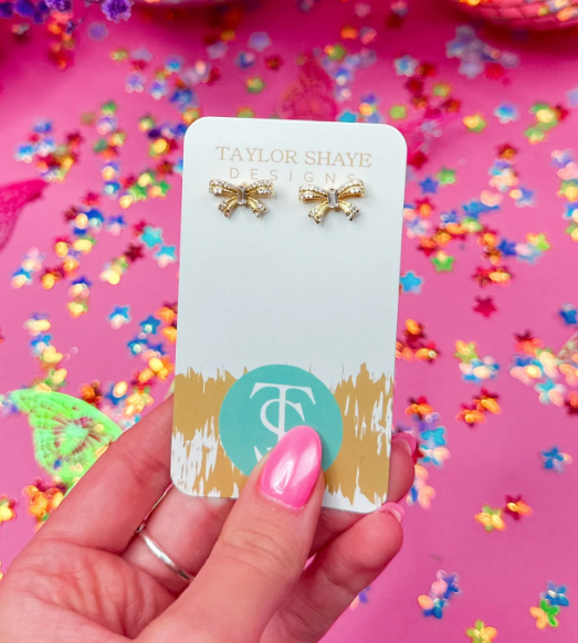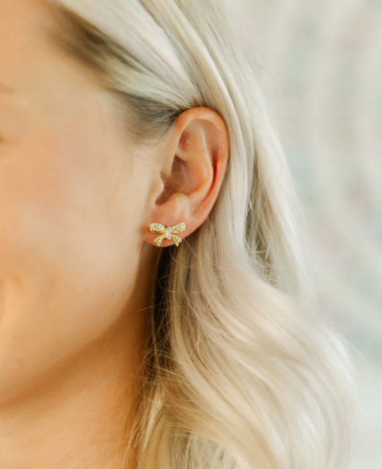 Elevate your everyday look with these stunning Crystal Gold Bow Studs from Taylor Shaye. Crafted with gold plating and adorned with sparkling cubic zirconia details, these delicate bow-shaped earrings add a touch of sophistication to any outfit. Perfect for layering or wearing solo, they're an effortless way to bring timeless elegance to your style. Lightweight and comfortable for all-day wear, these versatile studs transition seamlessly from casual to dressy occasions.