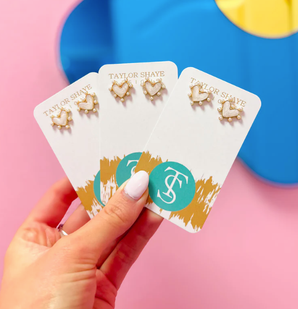 These delicate gold heart studs combine timeless elegance with a modern twist. Each earring features a lustrous pearl at its center, surrounded by a halo of smaller pearls that catch the light beautifully. The warm gold setting complements the soft pearl tones, creating a sophisticated accessory perfect for everyday wear or special occasions. Ideal for adding a touch of refined charm to any outfit.