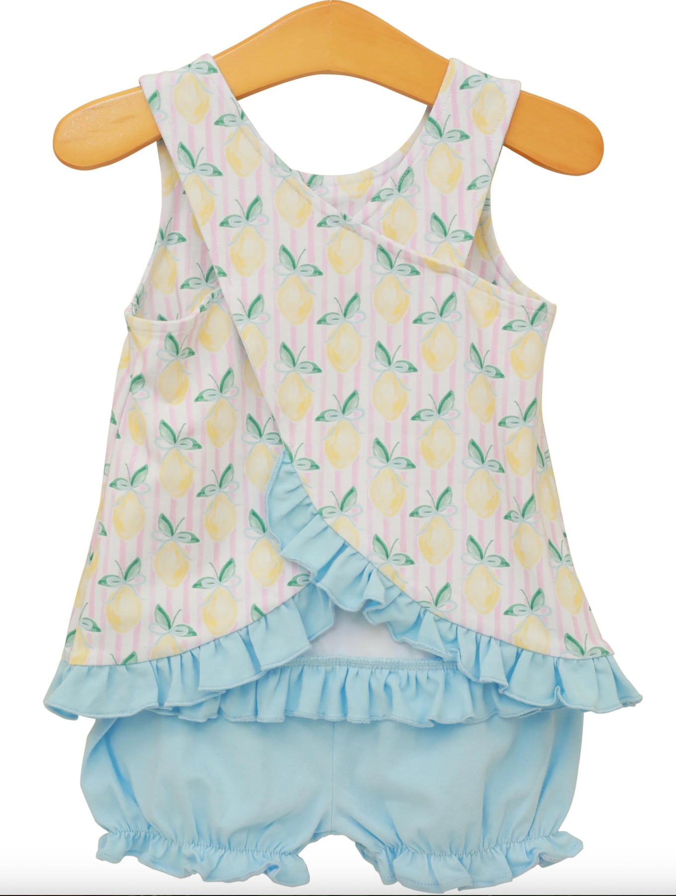 This cheerful swing back set brings joy with its vibrant "Squeeze The Day" lemon print and delightful ruffle trim that bounces with every adventure. Perfect for little ones who love bold, happy designs, the relaxed fit and playful details make it ideal for warm-weather fun. Watch your child's confidence shine as bright as the sunny citrus pattern!