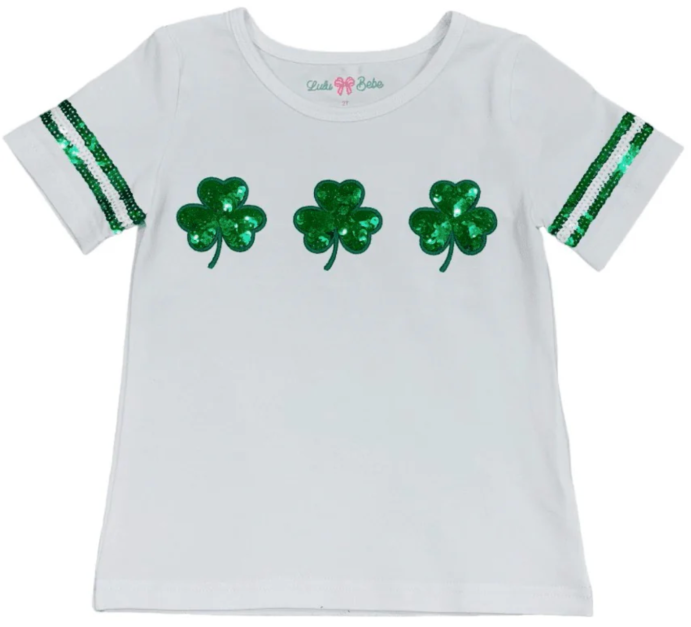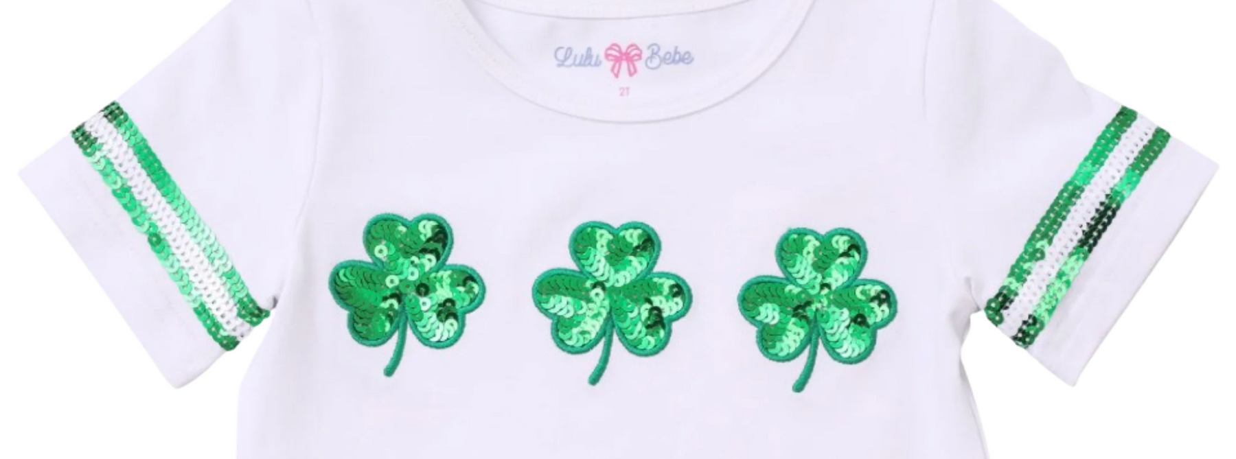 Celebrate St. Patrick's Day in style with this eye-catching white short sleeve tee from Lulu Bebe. Shimmering green sequin clovers dance across the chest while matching sequin trim adorns the sleeves, creating a festive look that sparkles with every move. Perfect for parades, parties, or holiday gatherings, this shirt lets your daughter shine bright and stand out from the crowd. A playful, memorable piece that captures the magic of the season.