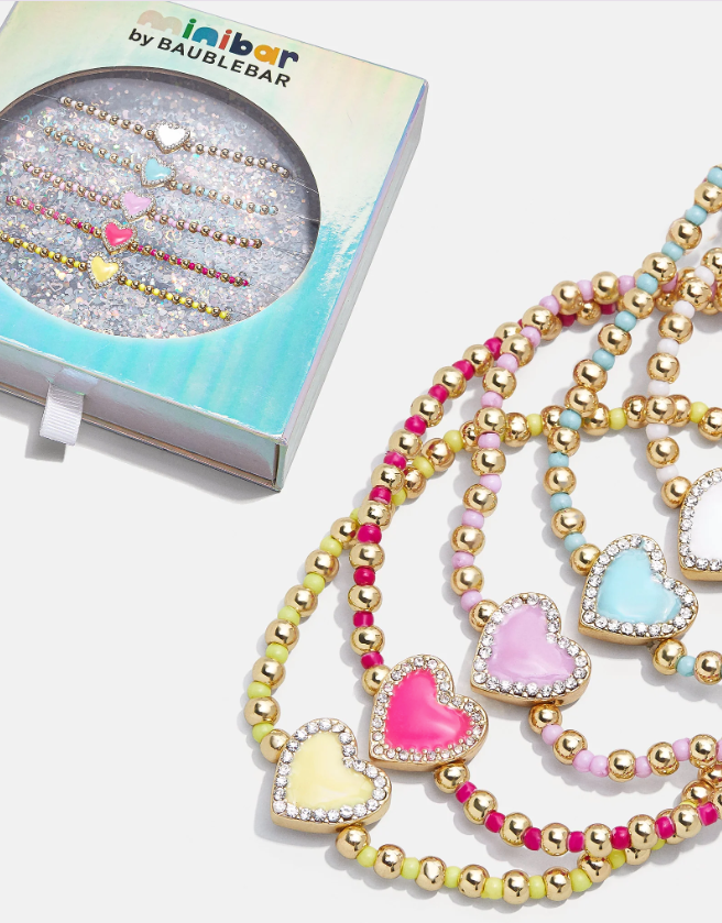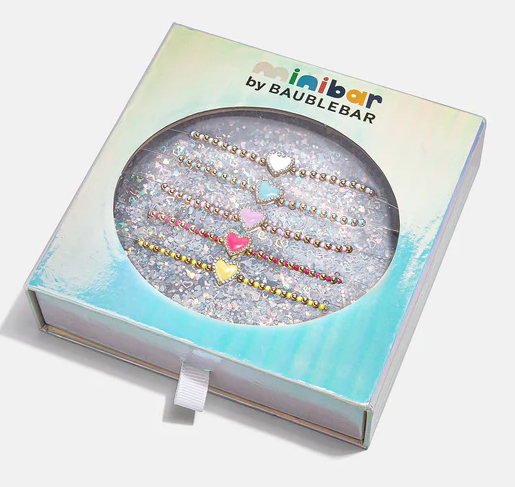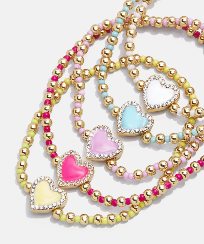 Five charming gold beaded bracelets await in this delightful set, each featuring a vibrant heart bead at its center. Perfect for gifting as a complete collection or sharing individually with friends, these versatile pieces let your child express her style while spreading joy. Durable and designed for young wrists, the Sweetheart Pisa Bracelet Set brings sparkle and sentiment to everyday wear.