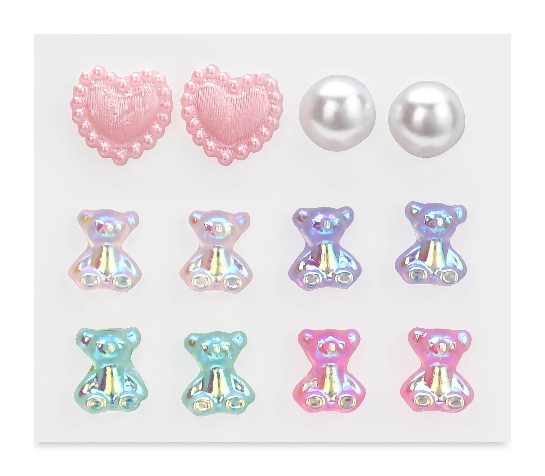 Girls will love this fun gift set featuring six pairs of stick-on earrings in assorted styles. Each pair adheres securely without piercing, making them perfect for young fashionistas who want to experiment with different looks. The colorful collection comes beautifully packaged in a peggable blister card (4" W x 6¼" H), ready to gift or display. No holes required—just peel, stick, and shine! Great for gifts and Easter Baskets!