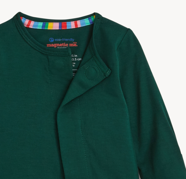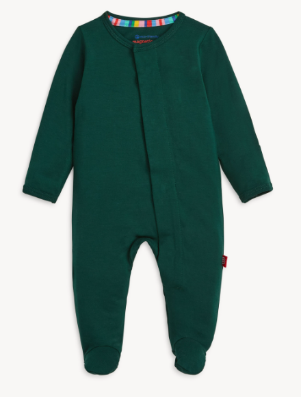 • Magnetic closures: magnets line the seam from the neck to upper thigh for sizes up to 0-3m & from neck to crotch for sizes 3-6m and up.