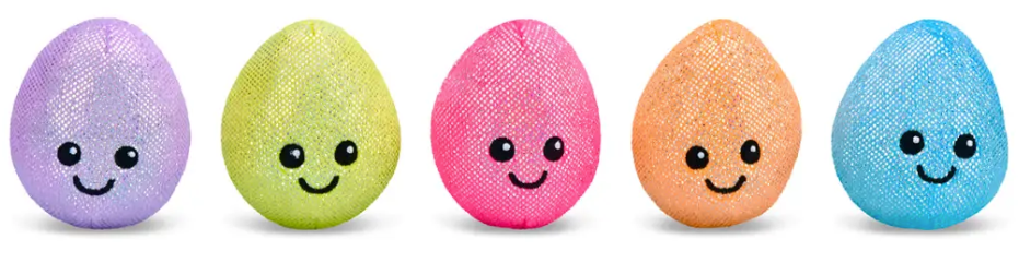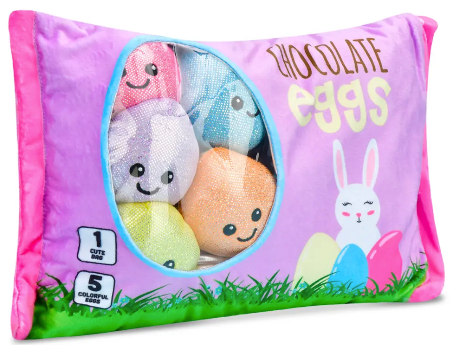 This adorable Easter eggs plush pillow brings interactive fun to springtime play! Featuring five removable colored eggs tucked inside a cozy fleece bag, kids can discover and play with each egg separately. The super soft fleece exterior with foil accents and charming embroidered details makes it perfect for cuddling or display. Complete with a convenient zipper closure for easy access, this 15½" wide pillow is crafted from durable polyester with polyfiber fill. An egg-cellent addition to any Easter basket or springtime collection!