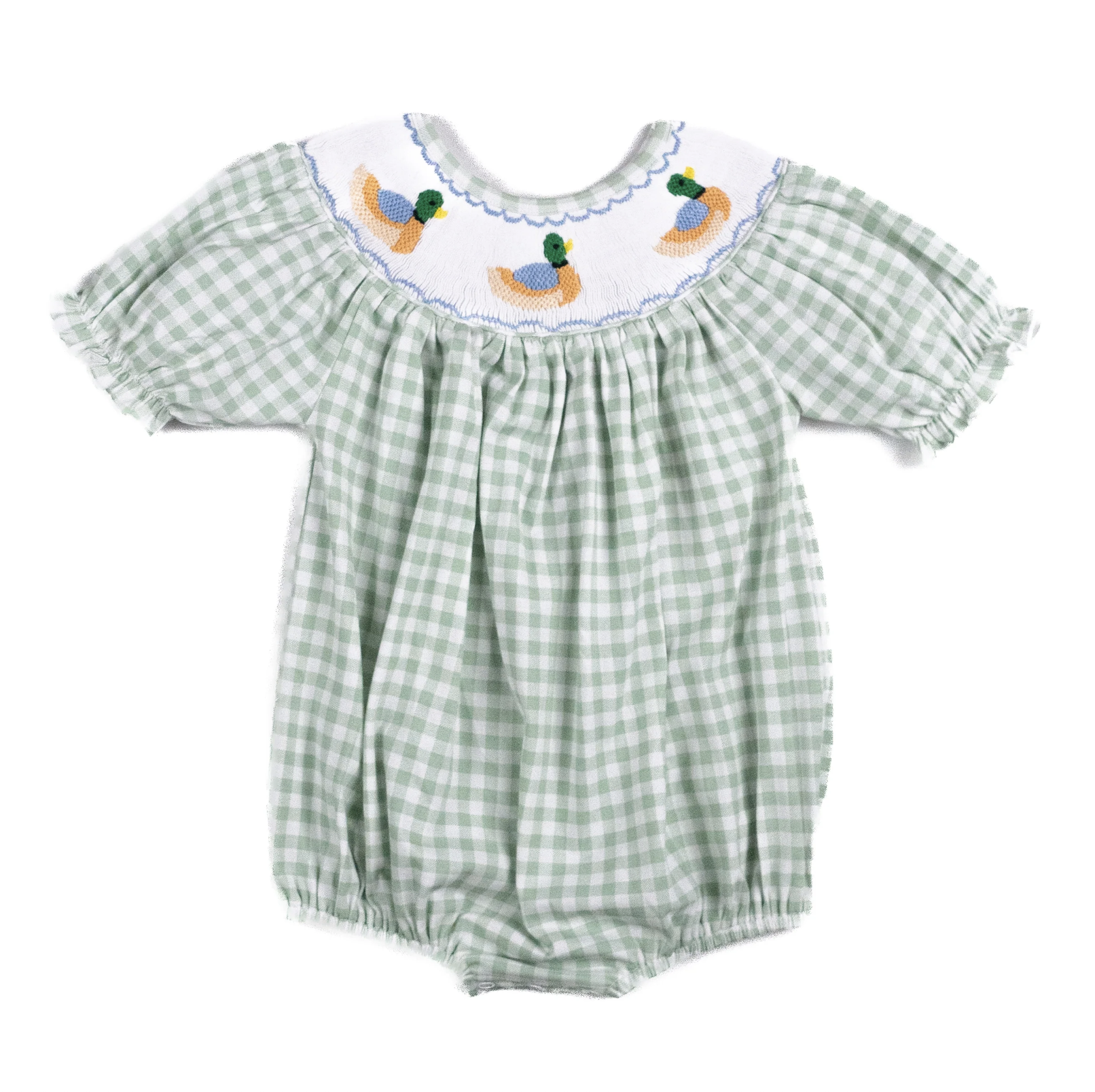 The Smocked Mallard Collection offers elegant sibling sets featuring girls' and boys' bubbles, a boys' shortall, and a girls' dress, all adorned in a refined sage green gingham print. These timeless pieces perfectly capture the essence of fall, creating a cohesive and sophisticated look ideal for family photoshoots. Each outfit blends classic charm with seasonal tones, making them a graceful choice for your little ones.