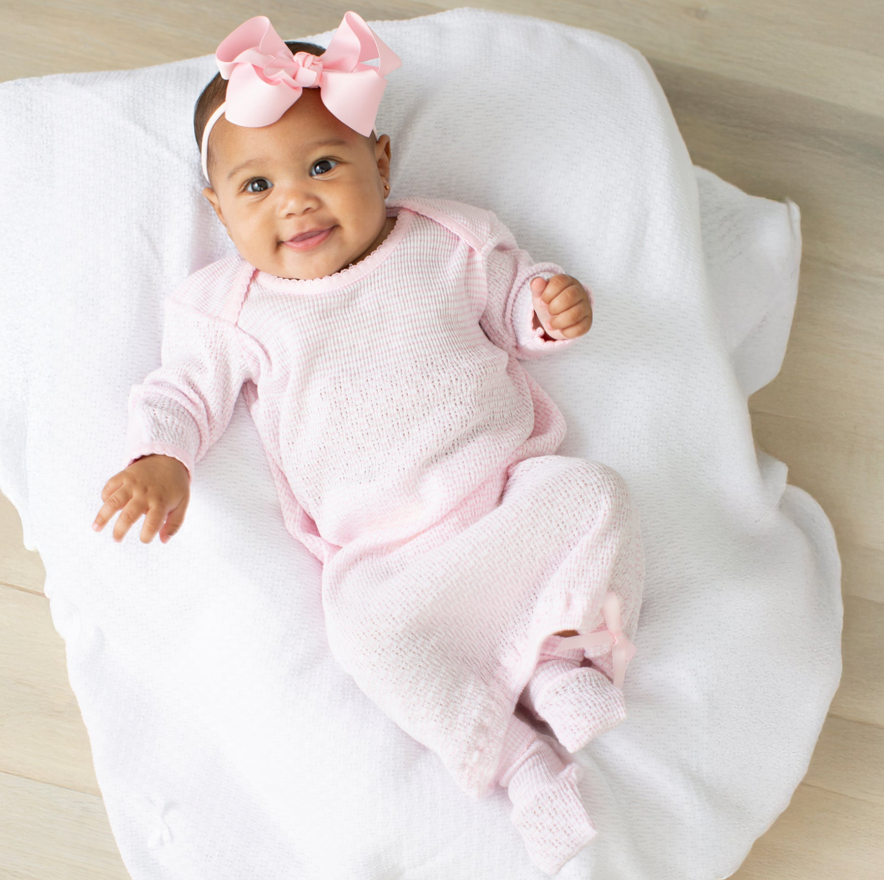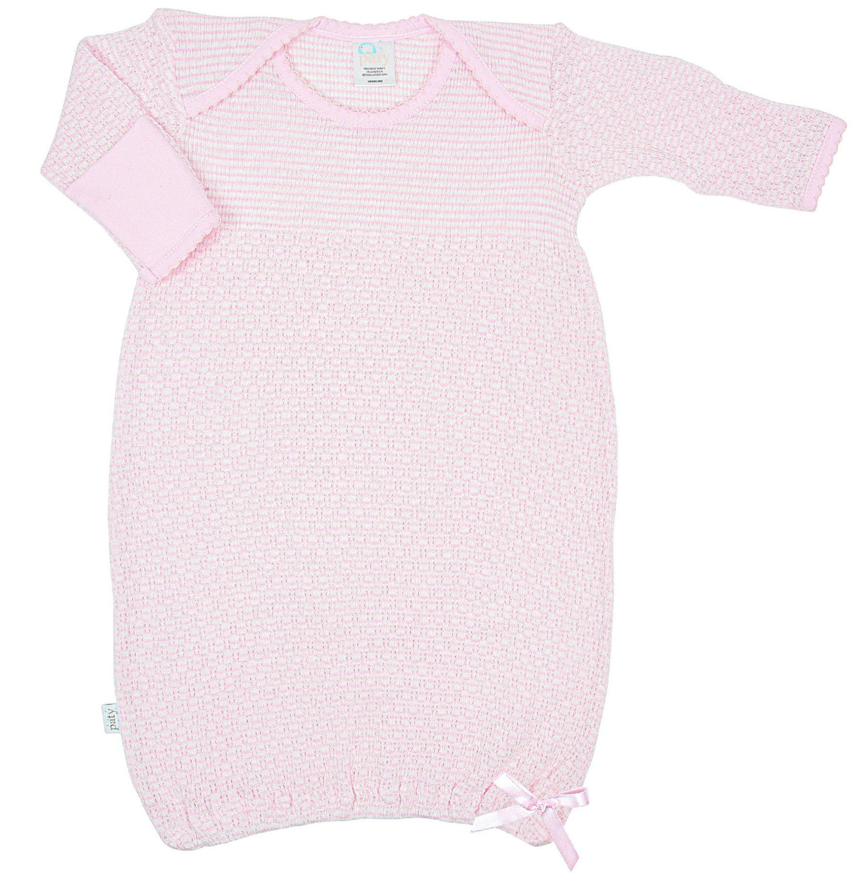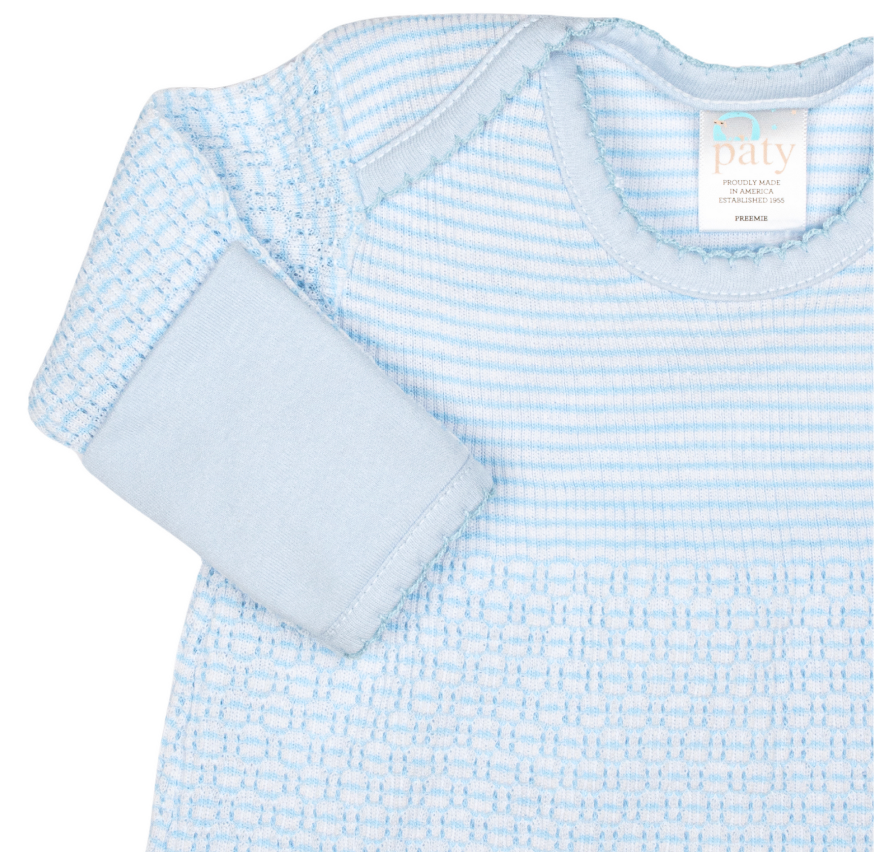Crafted in Houston, Texas, the Solid Stripe Overlap Shoulder Gown from Paty features delicate pima cotton trim and built-in fold-over cuffs that keep little hands warm while protecting sensitive skin. Its thoughtful design combines comfort and elegance, making it an ideal choice for your baby's delicate needs.